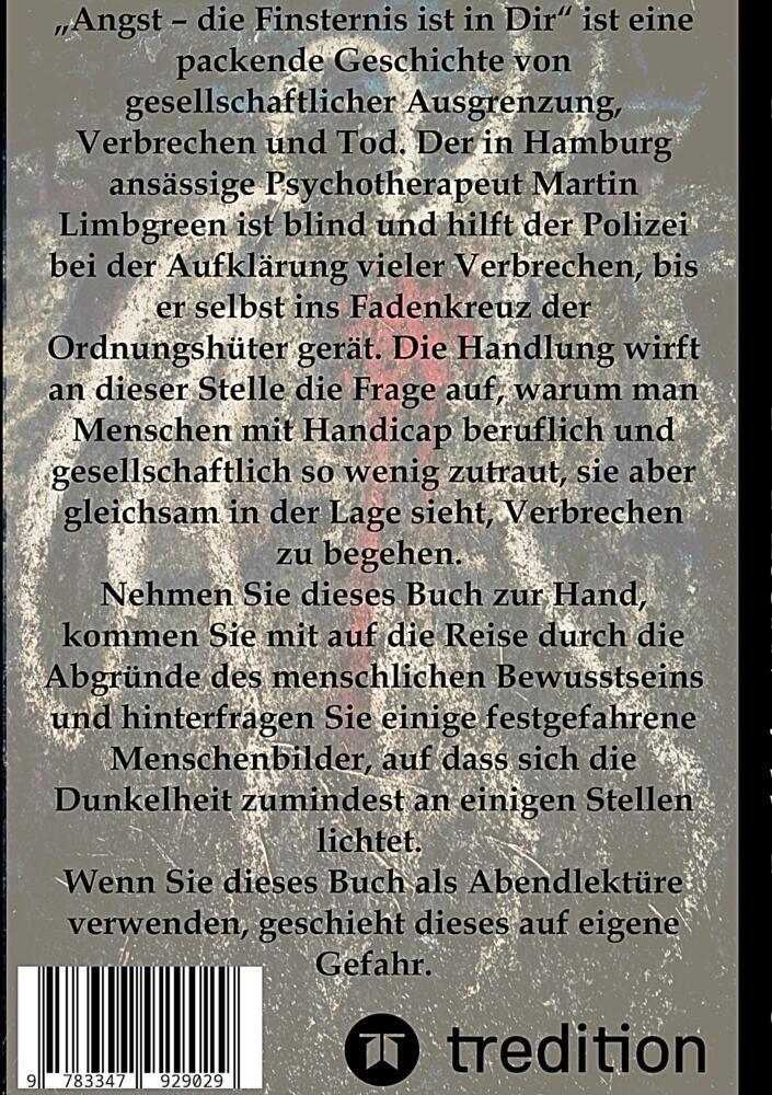 Angst die Finsternis ist in Dir ist eine packende Geschichte von gesellschaftlicher Ausgrenzung, Verbrechen und Tod. Der in Hamburg ansässige Psychotherapeut Martin Limbgreen ist blind und hilft der Polizei bei der Aufklärung vieler Verbrechen, bis er selbst i...