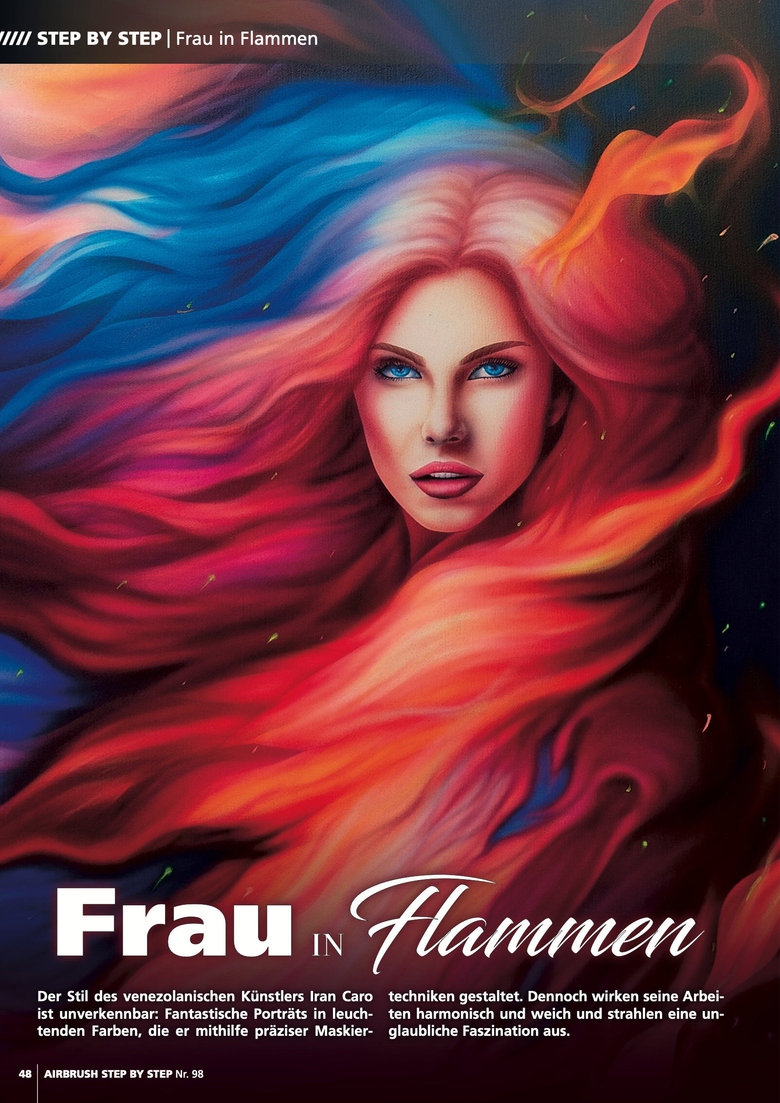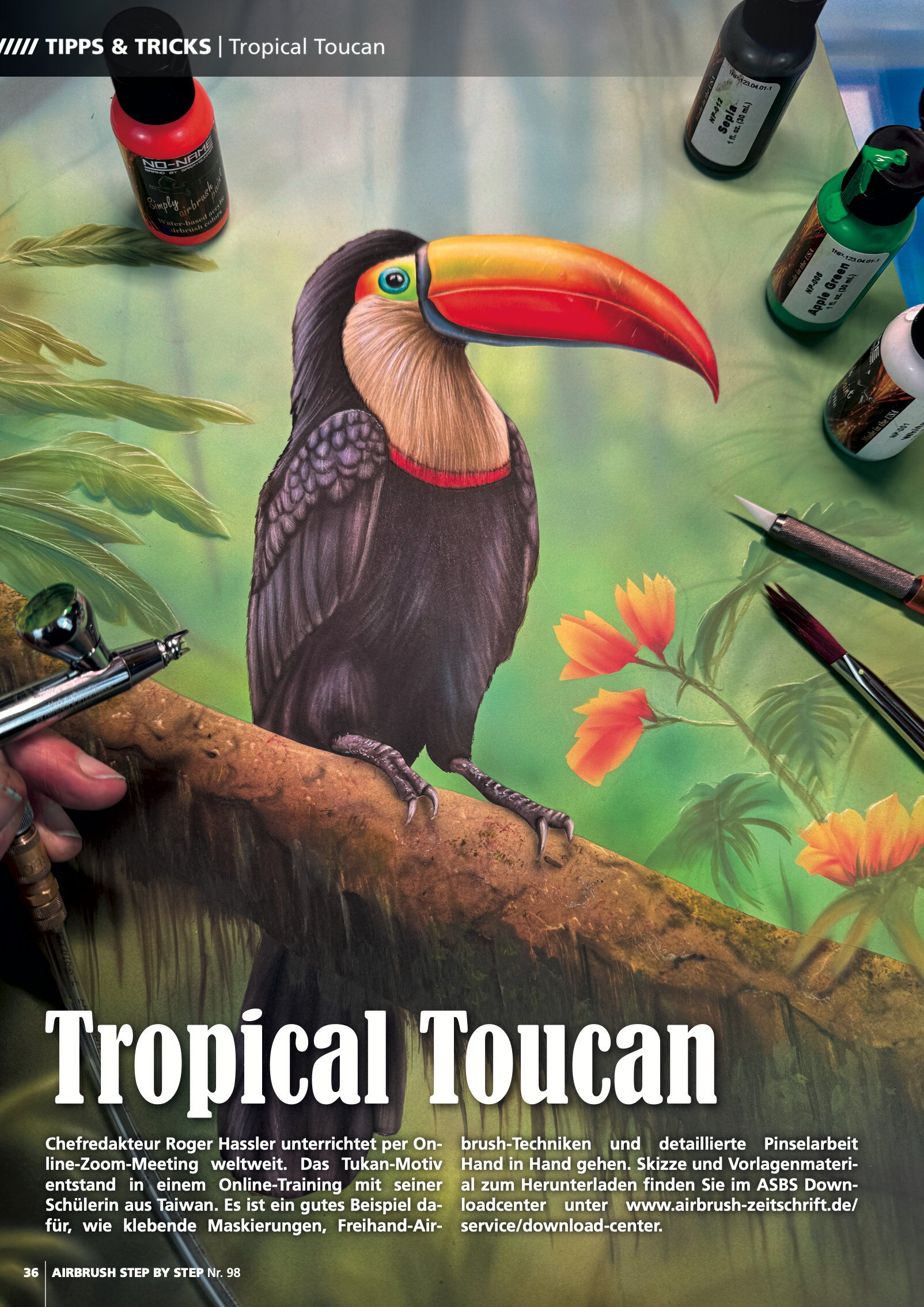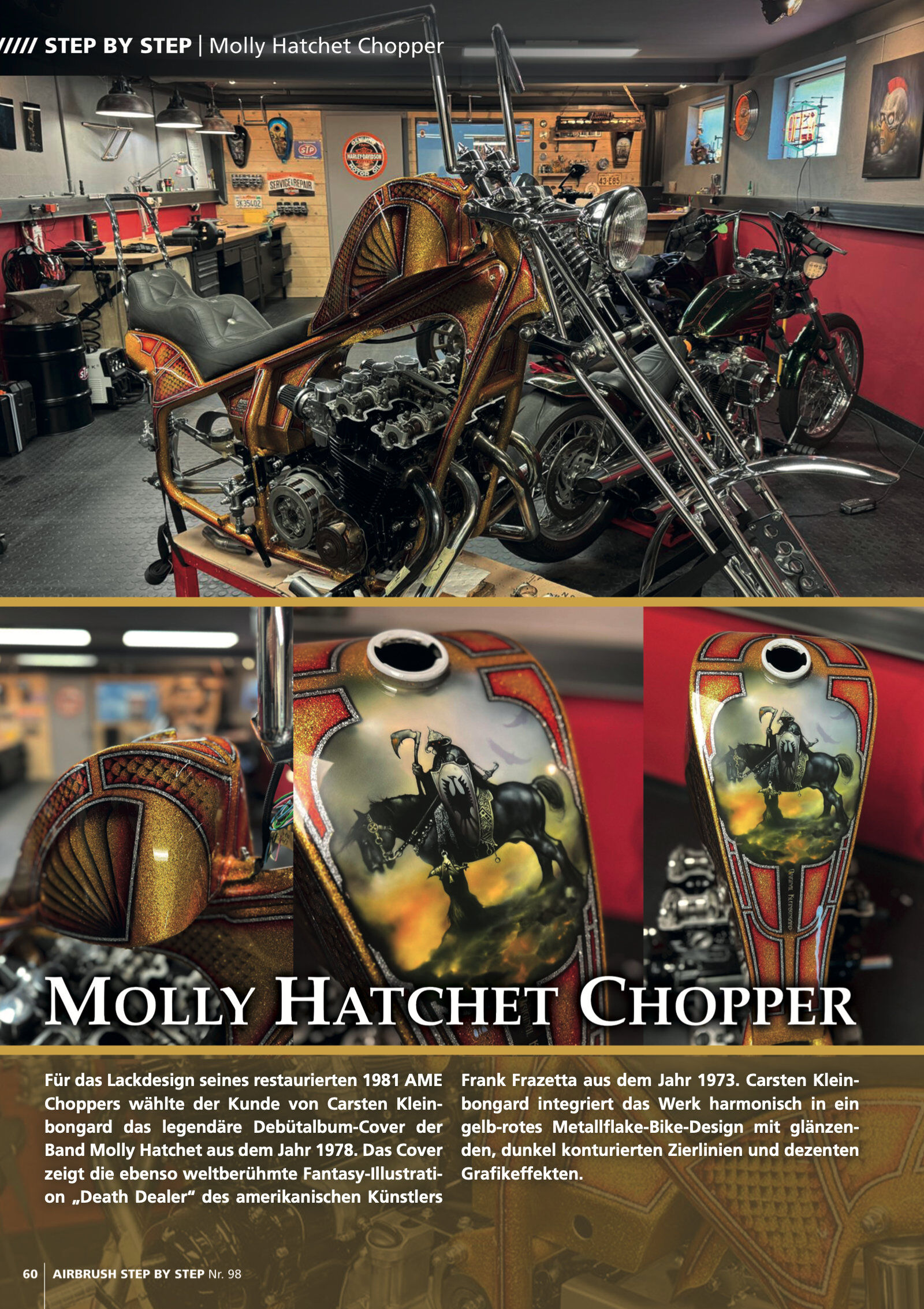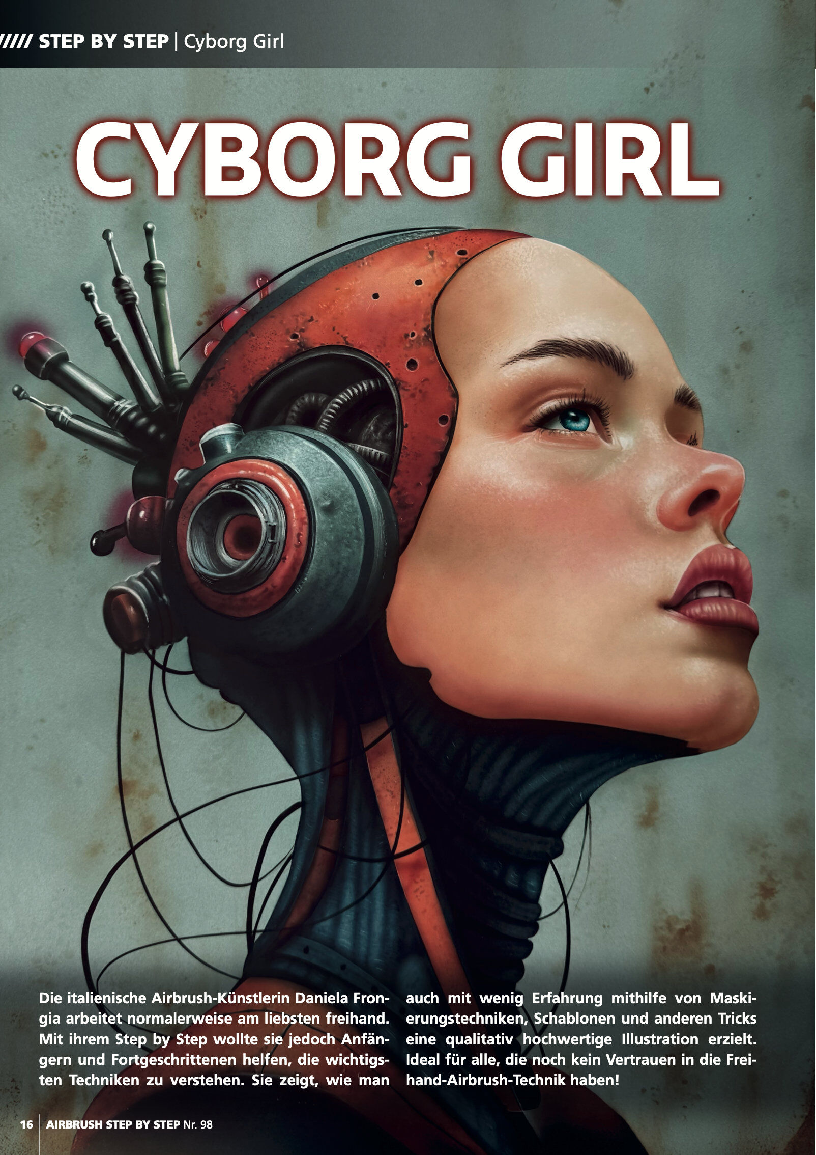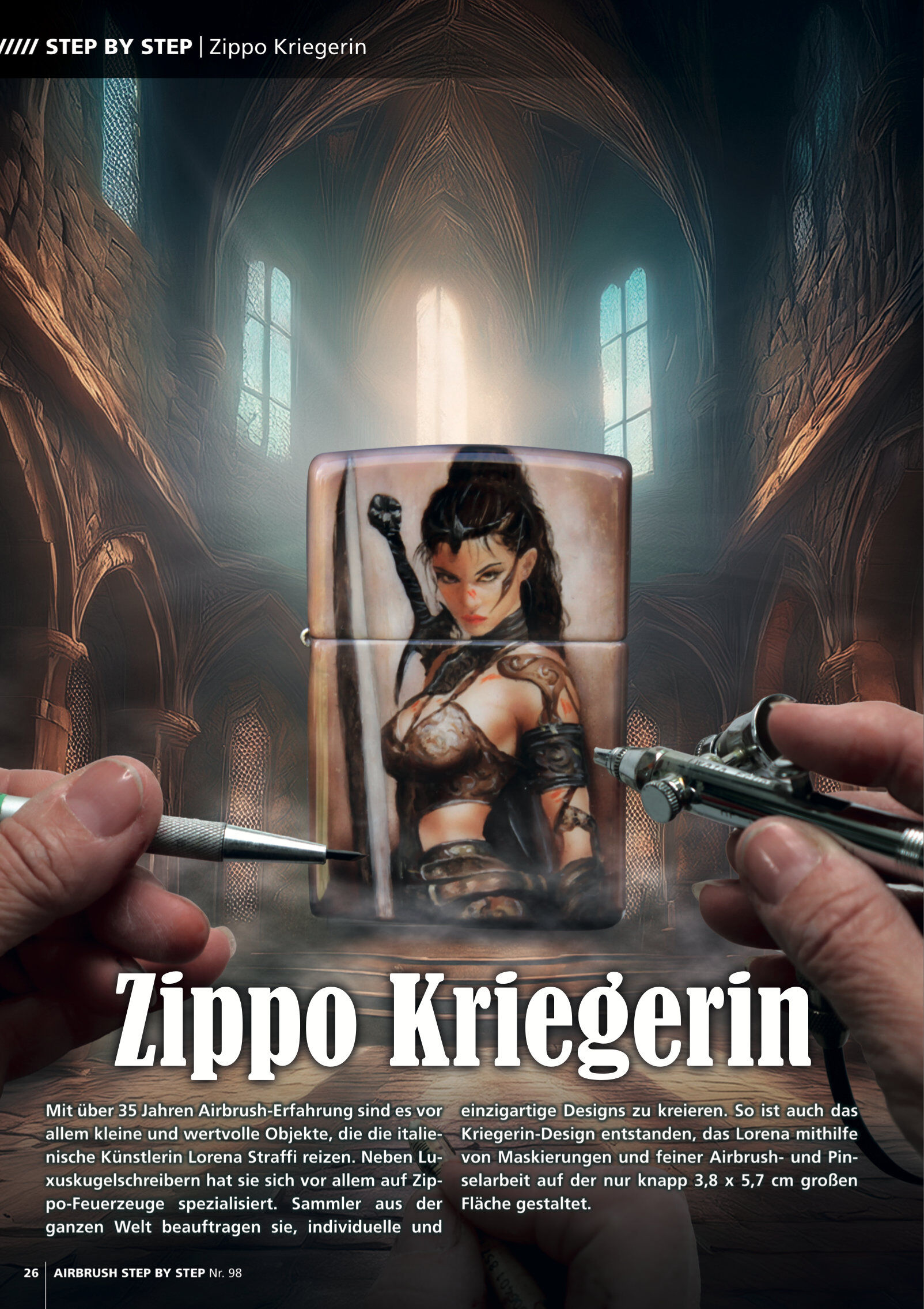 Step by Steps: SciFi-Porträt von Daniela Frongia Zippo-Bemalung von Lorena Straffi Metalflake-Motorrad-Design von Carsten Kleinbongard Feuereffekt-Porträt von Iran Caro Tropische Vodel-Illustration von Roger Hassler Interview: Die gemeinsame Airbrush-Leidensch...