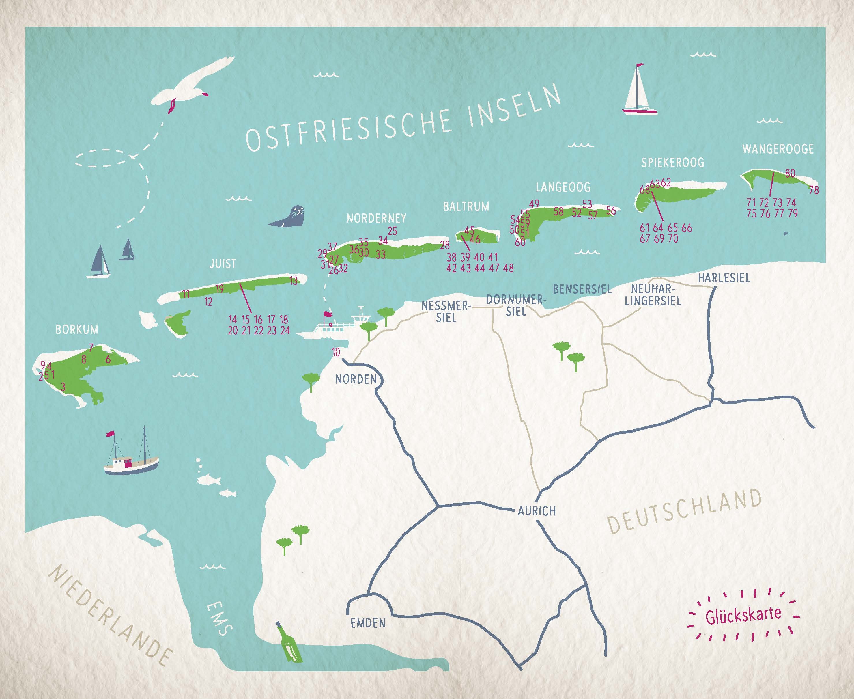 Die sieben Ostfriesischen Inseln sind pures Glück! Nur hier gibt es den Rundum-Sorglos-Blick vom Spiekerooger Utkieker, den legendären Juister Rosinenstuten und die Krabben-Muddi von Baltrum. In Borkums Schnuckenschäferei und Langeoogs Möwenkolonie ist tierisc...