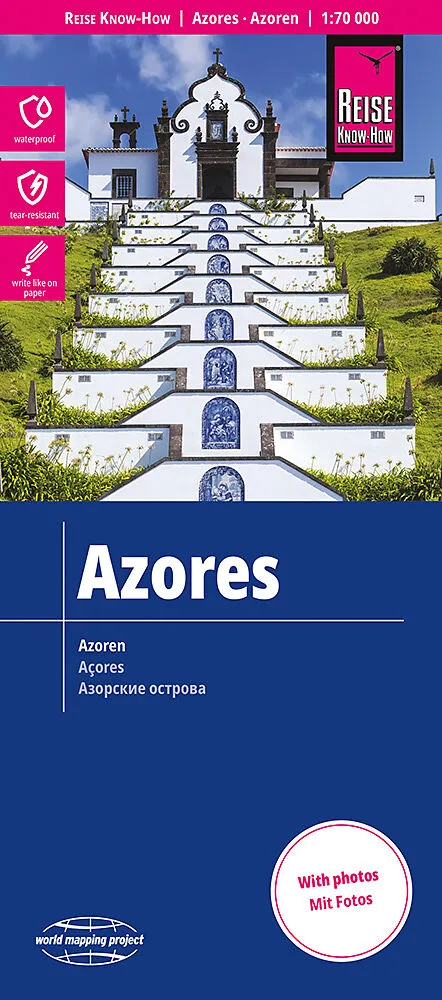 Hochreißfeste und 100% wasserfeste Landkarte "Azoren" aus der Serie world mapping project. Reise Know-How Landkarten zeichnen sich durch besonders stabiles Kunststoffpapier aus, das beschreibbar ist wie Papier, sogar mit Bleistift. Der Pappumschlag ist abnehm...