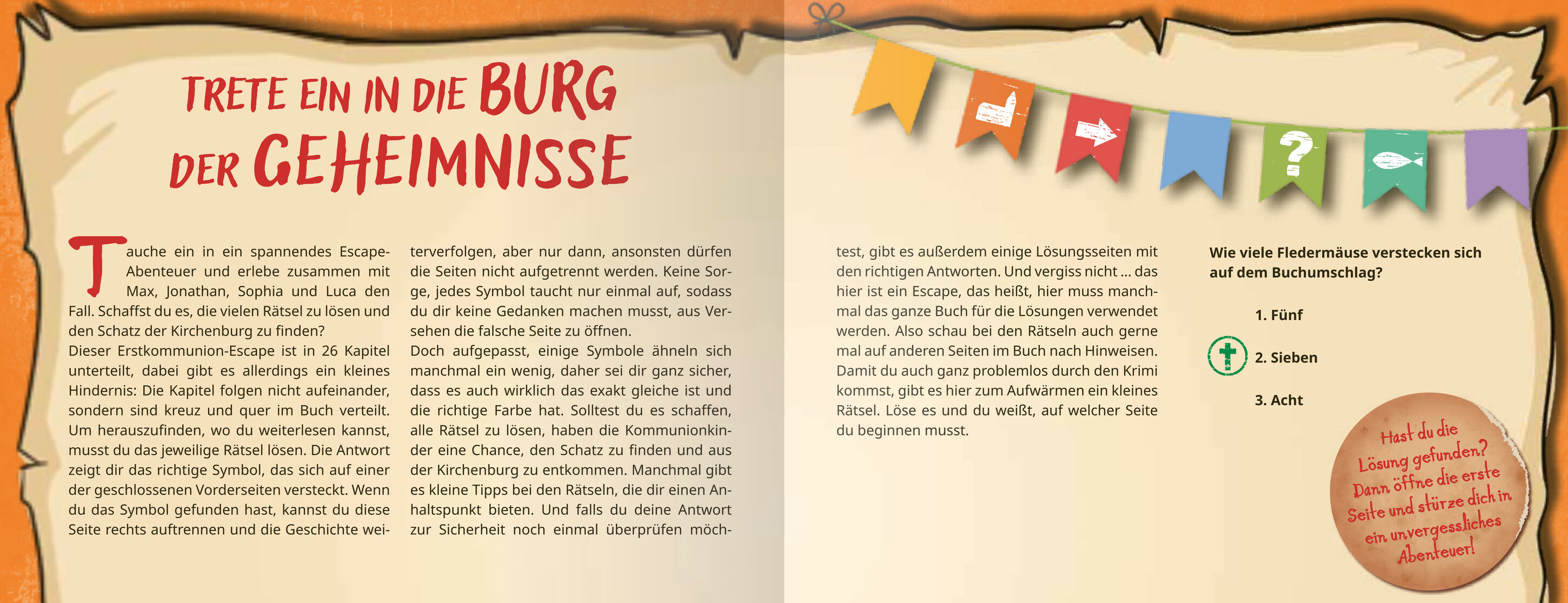 Der neue Erstkommunion-Escape Eintauchen, rätseln und mitfiebern! Das perfekte Geschenk zur Kommunion: Eine spannende Geschichte im Escape-Abenteuer-Stil und 20 knifflige Rätsel. Eine Schatzsuche? Wie spannend! Das denken sich Max, Sophia, Jonathan und Luca, a...