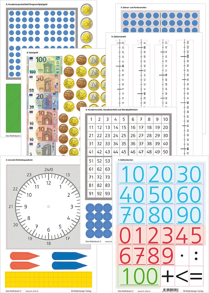Dem Mathebuch 2 liegen stabile kartonierte Arbeitsbeilagen bei: Zahlenkarten Hundertertafel, Hunderterfeld und Wendeplättchen Hunderterpunktefeld/Tangram/Spielgeld Lernuhr/Einheitsquadrate Zahlenstrahl Spielgeld Zehner- und Fünferstreifen Klappentext Dem Math...