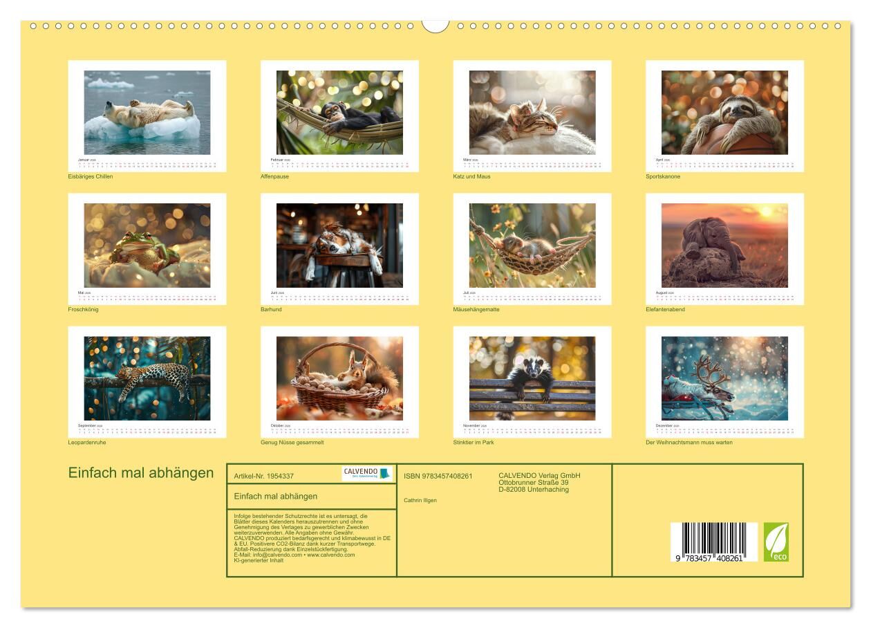 Lass dich von unseren tierischen Freunden in die Welt der Entspannung entführen. Unser Kalender zeigt KI-generierte Fotos von Tieren, die einfach mal abhängen und den Alltagsstress vergessen. Vom lässigen Eichhörnchen, das im Körbchen döst, bis hin zum entspan...