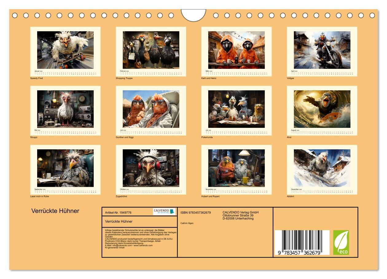 Du magst Hühner und andere gefiederte Freunde? Du suchst nach einem Kalender, der dich jeden Monat zum Lachen bringt? Dann ist dieser Kalender genau das Richtige für dich! Dieser Kalender zeigt dir 12 lustige Bilder, die von einer künstlichen Intelligenz gener...