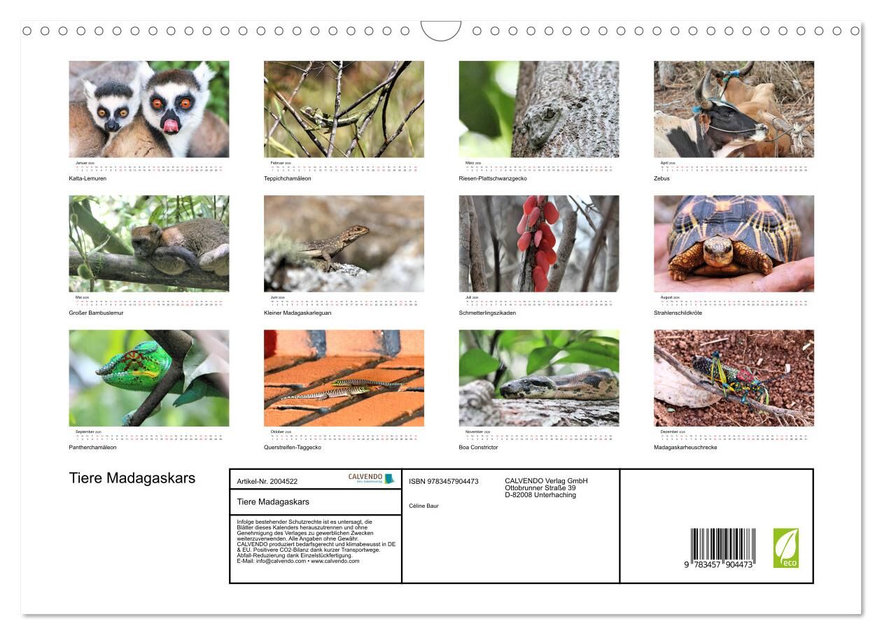 Madagaskar ist weltberühmt als Biodiversitäts-Hotspot. Ob niedliche Lemuren, farbenfrohe Chamäleons, gut getarne Geckos oder ungewöhnliche Insekten. Der Kalender zeigt einige der faszinierenden Tiere, für die Madagaskar bekannt ist.