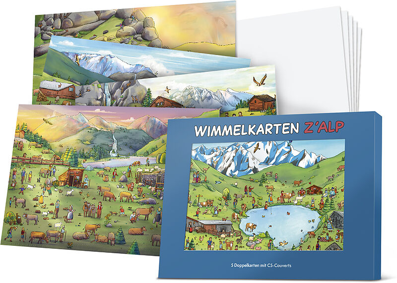 Das Wimmelkartenset z'Alp beinhaltet fünf wunderschön illustrierte Alp-Szenen und zeigt die bunte Schönheit und Vielfältigkeit der Schweizer Berglandwirtschaft. Es enthält zudem fünf weisse Couverts. Pro verkauftem Kartenset geht CHF 1. an die Coop Patenschaft...