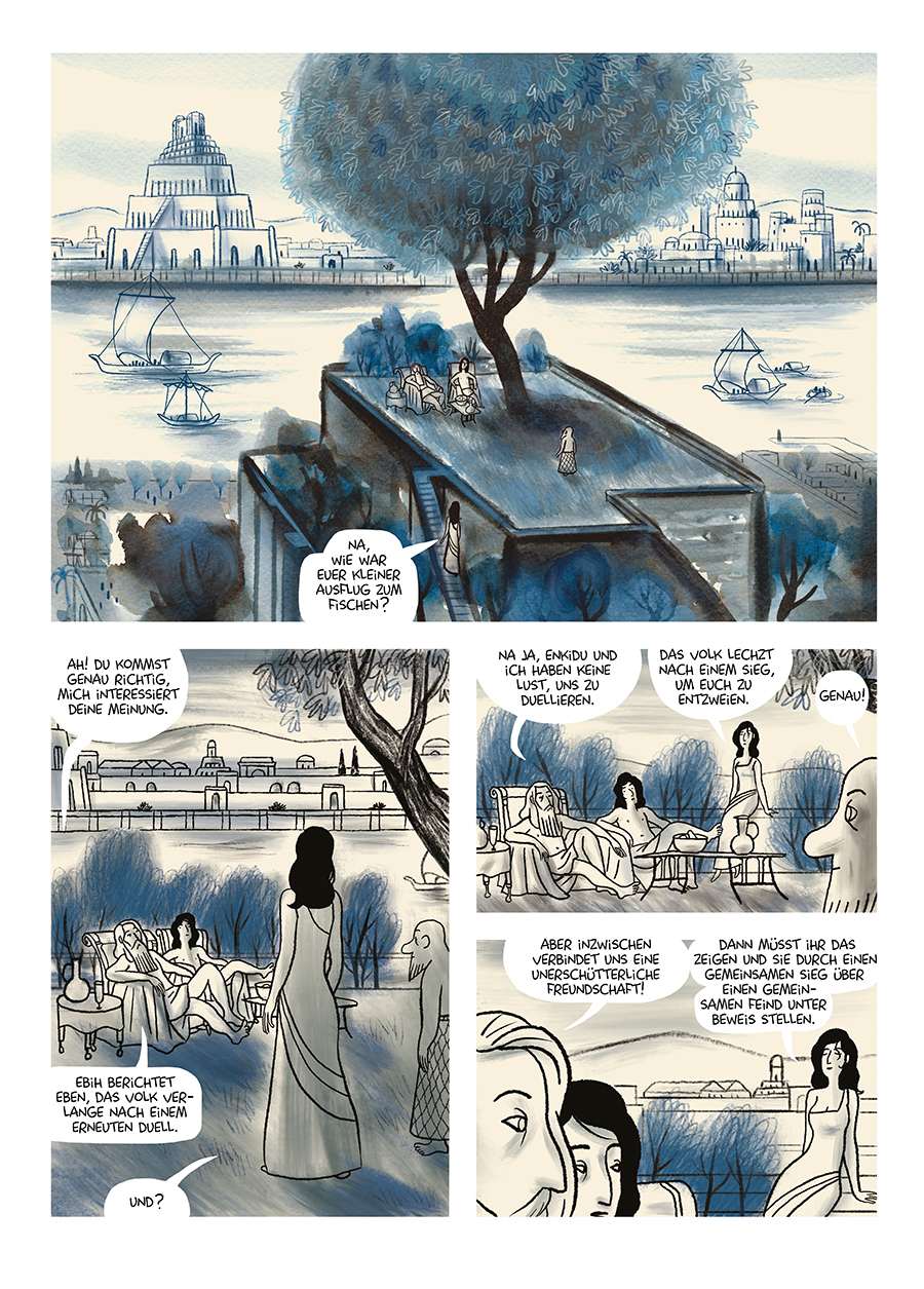 Gilgamesch ist einsam, denn sein Volk fürchtet den tyrannischen König. Er bittet Shamhat, seine Kurtisane, einen weißen Leoparden zu zähmen, der ihm ein Freund sein soll. Shamhat kehrt von dieser Mission mit Enkidu, einem nackten Wilden, zurück. Nachdem die be...