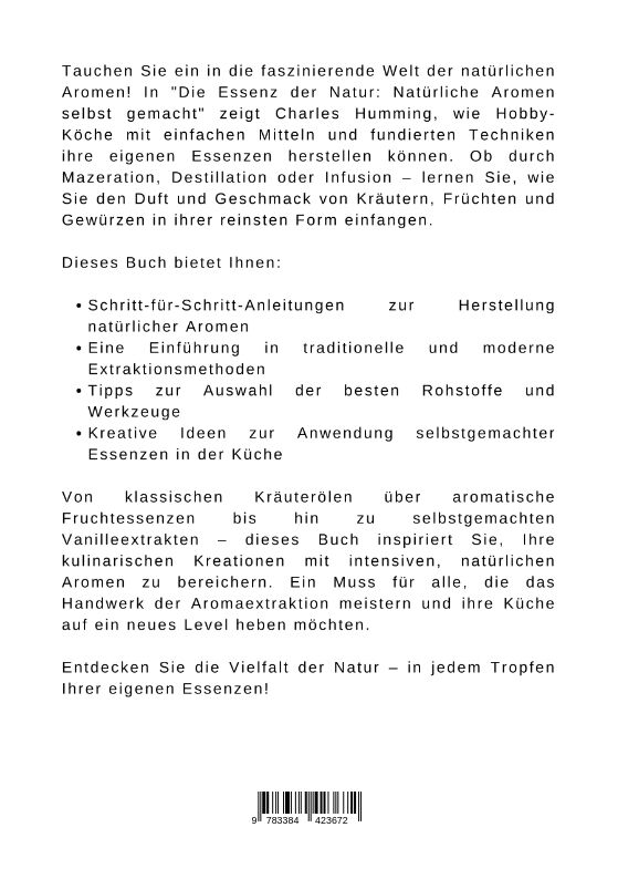 Tauchen Sie ein in die faszinierende Welt der natürlichen Aromen! In "Die Essenz der Natur: Natürliche Aromen selbst gemacht" zeigt Charles Humming, wie Hobby-Köche mit einfachen Mitteln und fundierten Techniken ihre eigenen Essenzen herstellen können. Ob durc...