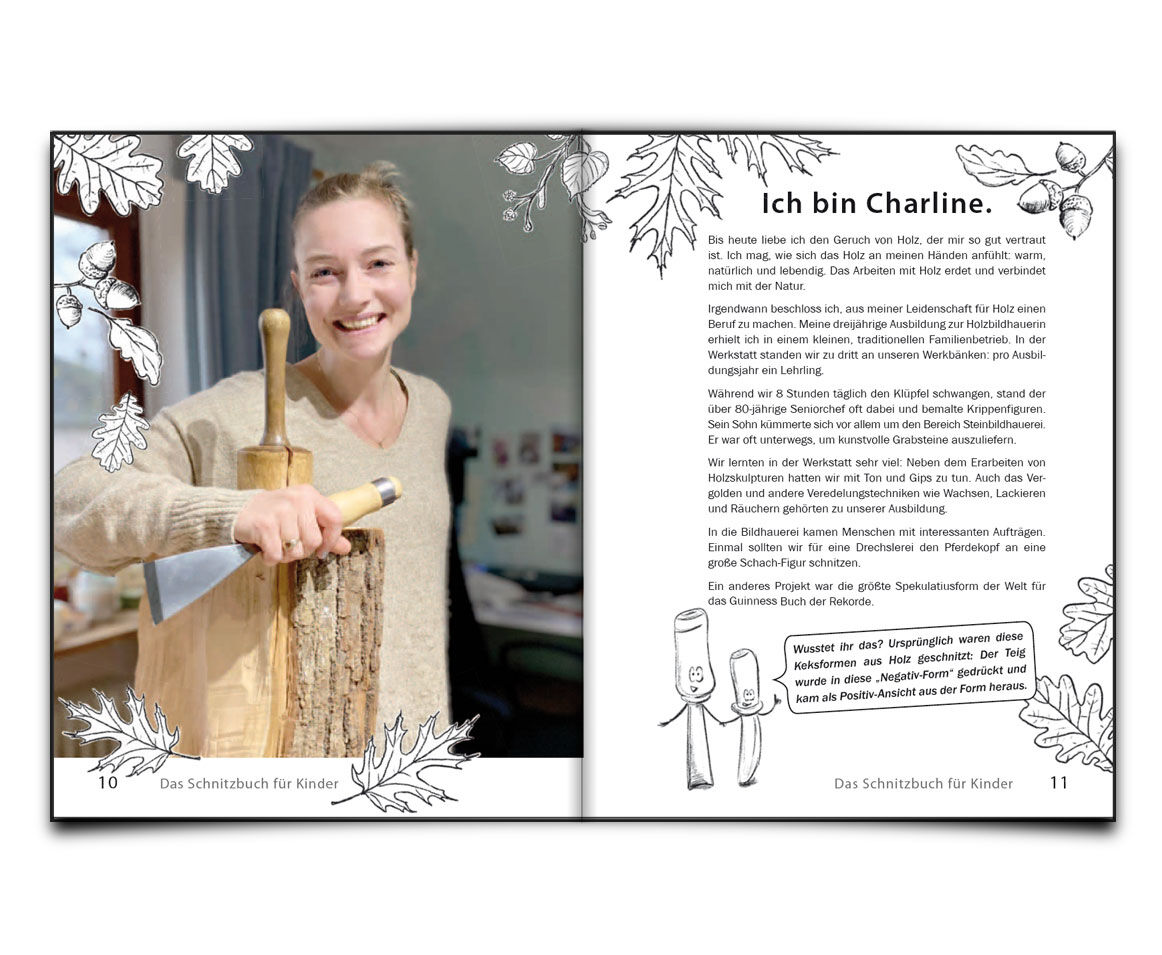Charline Alcantara ist ausgebildete Holzbildhauerin und Mutter. In ihrem Atelier in Norddeutschland gibt sie regelmäßig Schnitzkurse. Für alle Kinder mit Lust auf Holz hat sie dieses Buch erschaffen.