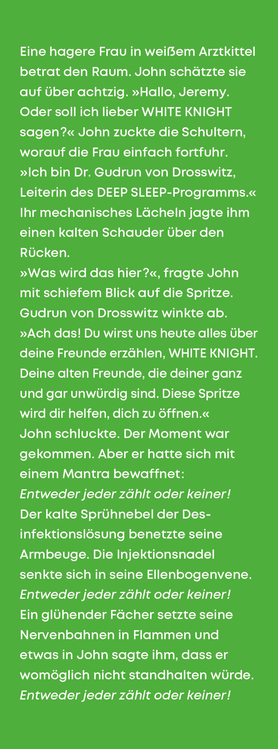Sein Deckname: WHITE KNIGHT. Seine Ausbildung: TOPSECRET. Sein Ziel: die Operation DEEP SLEEP auffliegen lassen. John kommt einer gefährlichen Verschwörung auf die Schliche: Mithilfe von GOOD MOTHER, einer allmächtigen KI mit unbegrenzten Ressourcen, wollen di...