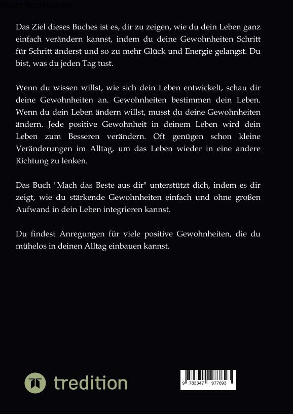 Das Ziel dieses Buches ist es, dir zu zeigen, wie du dein Leben ganz einfach verändern kannst, indem du deine Gewohnheiten Schritt für Schritt änderst und so zu mehr Glück und Energie gelangst. Du bist, was du jeden Tag tust. Wenn du wissen willst, wie sich de...