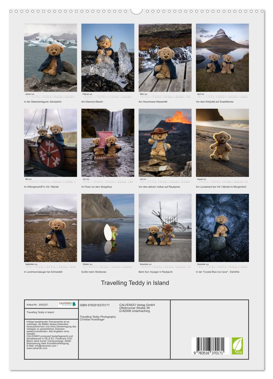Dieser Travelling Teddy Kalender zeigt 13 weltweit einzigartige Bilder aus Island mit dem wohl süßesten Weltenbummler. Alles Bilder werden authentisch Vorort fotografiert, ohne jede Fotomontage, sowohl am aktiven Vulkan als auch im selbst gebaut Floss. Der Kal...
