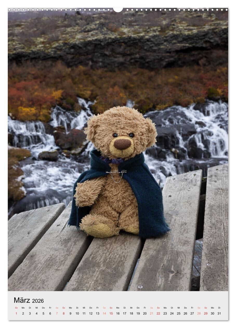 Travelling Teddy in Island (hochwertiger Premium Wandkalender 2026 DIN A2 hoch), Kunstdruck in Hochglanz