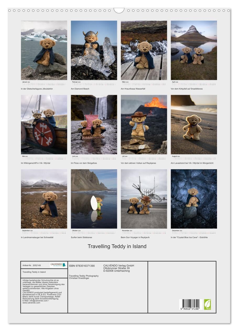 Dieser Travelling Teddy Kalender zeigt 13 weltweit einzigartige Bilder aus Island mit dem wohl süßesten Weltenbummler. Alles Bilder werden authentisch Vorort fotografiert, ohne jede Fotomontage, sowohl am aktiven Vulkan als auch im selbst gebaut Floss. Der Kal...