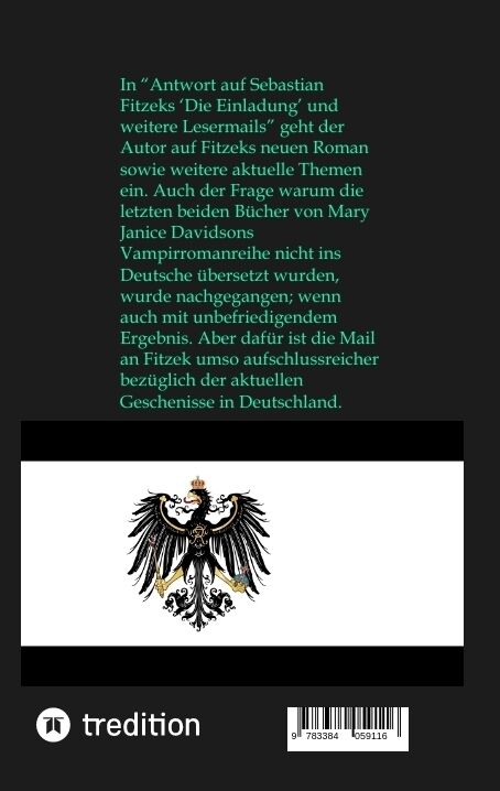 In dem Buch wird auf das neue Werk "Die Einladung" von Sebastian Fitzek eingegangen. Die entsprechende Lesermail geht von Seite 4 bis Seite 60. Außerdem wird auf viele aktuelle Themen eingegangen, die in der heutigen Bundesrepubilk Deutschland eine Rolle spiel...