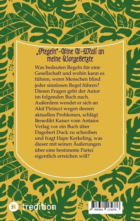 Was bedeuten Regeln für eine Gesellschaft und wohin kann es führen, wenn Menschen blind jeder sinnlosen Regel führen? Diesen Fragen geht der Autor im folgenden Buch nach. Außerdem wendet er sich an Akif Pirincci wegen dessen aktuellen Problemen, schlägt Benedi...