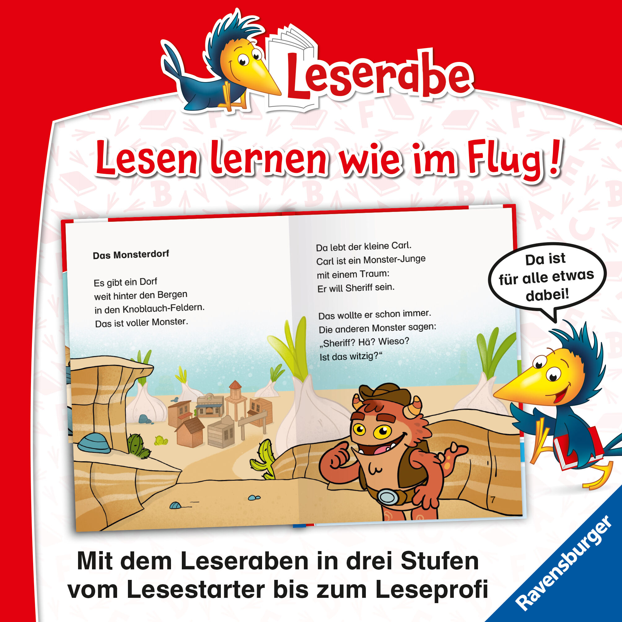 Lesen lernen wie im Flug! Carl möchte Sheriff werden. Wieso? Das fragen sich auch die anderen Monster. Sie sind dagegen. Nur Susi, Carls Freundin, hält zu ihm. Eines Tages kommen die Banditen Ete und Petete in die Dorfkneipe. Dort trinken sie Knoblauch-Limonad...