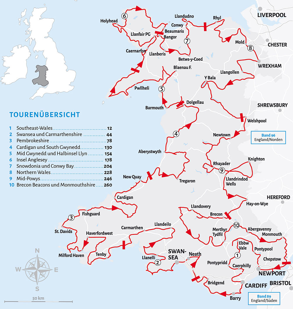 Unsere persönlichen Top Ten . . . . . . . . . . . . . . . . . . . . . . . . . . . . . . . . . 6 Gebrauchsanleitung . . . . . . . . . . . . . . . . . . . . . . . . . . . . . . . . . . . . . . . . . . 8 Tour 1: Cardiff und Southeast Wales . . . . . . . . . . . . . . . . . . . . . . . . . 12 Caldicot - Magor - Newport - Carleon - Cwmbran - Pontypool Blaenavon - Ebbw Vale - Ystrad Minach - Caerphilly - Cardiff Barry - Ogmore - Merthyr Mawr - Bridgend - Porthcawl Tour 2: Swansea und Carmarthenshire . . . . . . . . . . . . . . . . . . . . . 42 Neath - Swansea - Gower Peninsula - Lanelli - Pembrey Kidwelly - Trapp - Llandeilo - Carmarthen - Llansteffan Laugharne - Pendine Tour 3: Pembrokeshire . . . . . . . . . . . . . . . . . . . . . . . . . . . . . . . . . . . . . 78 Tenby - Manorbier - Lamphey - Stackpole - Freshwater Pembroke - Carew - Haverfordwest- Milford Haven - Dale Marloes - St.Davids - Fishguard - Newport - Newcastle Emlyn Cenarth - Cardigan - Penbryn - Aberaeron Tour 4: Ceredigion und South Gwynedd. . . . . . . . . . . . . . . . . . . 130 Llansantfraed - Tregaron - Strata Florida - Devil`s Bridge Rheiddol Valley - Aberystwyth - Borth - Ynylas Machynlleth - Dolgellau Tour 5: Mid Gwynedd und Halbinsel Llyn . . . . . . . . . . . . . . . . . . . 154 Ganllwyd - Barmouth - Harlech - Blaenau Ffestiniog - Beddgelert Porthmadog - Portmeirion - Criccieth - Llyn Peninsula Tour 6: Die Insel Anglesey . . . . . . . . . . . . . . . . . . . . . . . . . . . . . . . . . . 178 Caernarfon - Llanfair PG - Aberffraw - Rhosneigr - Treaddur Holyhead - Church Bay - Caermes - Amlwch - Lligwy Bay Benlech - Penmon Point - Beaumaris - Menai Bridge Inhaltsverzeichnis Tour 7: Snowdonia und Conwy Bay . . . . . . . . . . . . . . . . . . . . . . . . 204 Bangor - Llanberis - Capel Curig - Betwys-y-Coed - Llanwrst Conwy - Llundadno - Colwyn Bay - Llandulas Tour 8: Northern Wales . . . . . . . . . . . . . . . . . . . . . . . . . . . . . . . . . . . 228 Abergele - Rhyl - Prestatyn - Bodelwyddan - Denbigh - Holwell Mold - Ruthin Wrexham - Llangollen - Cefn-mawr - Chirk Llanrhaeadr - Bala - Llanwddyn Tour 9: Mid Powys . . . . . . . . . . . . . . . . . . . . . . . . . . . . . . . . . . . . . . . . . 246 Welshpool - Abermule - Newtown - Llanidloes - Rhayader Elan Valley - Knighton - Presteigne - Llandrindod Wells Builth Wells - Hay-on-Wye Tour 10: Brecon Beacons bis Monmouthshire . . . . . . . . . . . . . . 260 Brecon - Llandovery - Dolaucothi - Tralley - Dan-yr-Ogof Craig-y-nos - Pontneddfechan - Ystradfeilte - Penderyn Merthyr Tydfi l - Tretower - Abergavenny - Raglan Monmouth - Tintern - Chepstow Tipps und Infos . . . . . . . . . . . . . . . . . . . . . . . . . . . . . . . . . . . . . . . . . . . . 282 Anreise · Allgemeine Landeskunde • Baden • Campingplätze / Campingclubs / Stellplätze / Parkplätze · Gas und Elektrizität · Geld • Geschichte •GPS / Navigation / Landkarten · Hunde · Kriminalität · Lebensmittel / Getränke • Maße / Gewichte · Notfälle · Reisezeit / Klima / Feiertage · Restaurants · Sehenswürdigkeiten / Öffnungszeiten · Telefonieren und Internet • Tourismus · Unfall · Verkehr / Straßen / Tankstellen · Wanderungen · Zeit • Bildnachweis Stichwortverzeichnis . . . . . . . . . . . . . . . . . . . . . . . . . . . . . . . . . . . . . . 307 Tourenübersicht . . . . . . . . . . . . . . . . . . . . . . hintere Umschlagklappe
