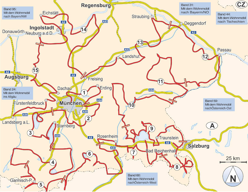 TOURENKARTEN Auf über 3000 km in 15 Touren alle großen Attraktionen und weniger bekannten Sehenswürdigkeiten im Süden Bayerns erkunden. Genaue Markierung freier Stell-, Bade-, Picknick-, Camping- und Wanderparkplätze inklusive Ausstattung. Einzeichnung von Mus...TOURENKARTEN Auf über 3000 km in 15 Touren alle großen Attraktionen und weniger bekannten Sehenswürdigkeiten im Süden Bayerns erkunden. Genaue Markierung freier Stell-, Bade-, Picknick-, Camping- und Wanderparkplätze inklusive Ausstattung. Einzeichnung von Museen, Schlössern, Kirchen uvm. NATUR ERLEBEN, WANDERN Wandern in den Voralpen, durch stille Wälder und über sanft geschwungene Viehweiden. Gipfel erklimmen, zu Fuß oder bequem per Seilbahn. Entspannen in zünftigen Biergärten zwischen uralten Kastanienbäumen. Schluchten, Höhlen, Seen und Täler mit allen Sinnen erfahren. KULTURSCHÄTZE, STÄDTE Schlösser wie Linderhof und Herrenchiemsee besichtigen. Wallfahrtsstätten von Altötting bis zur Wieskirche erleben. In die Weltstadt München eintauchen. Geschichtsträchtige Orte wie Landshut und Passau besuchen. Spuren von Kelten, Bajuwaren und Römern aufspüren. WASSER ERLEBEN, BADEN Tosenden Wasserfällen in wilden Bergklammen folgen, auf bekannte Flussläufe wie Donau, Inn und Isar treffen, unzählige tolle Badeplätze an herrlichen Seen entdecken. In Thermen die Seele baumeln lassen und die bayerische Seenschifffahrt zwischen Ammer- und Königssee nutzen. WOMO-SERVICE Wir vermerken über 380 Plätze zum Übernachten mit Anfahrtsbeschreibung und GPS-Kordinaten. Wir führen die Ausstattung, wie z.B. Ver-/ Entsorgung und Strom auf. Wir geben Hinweise zu geeigneten Tagesparkplätzen in Städten, informieren über Preise und Zeiten von Sehenswürdigkeiten.