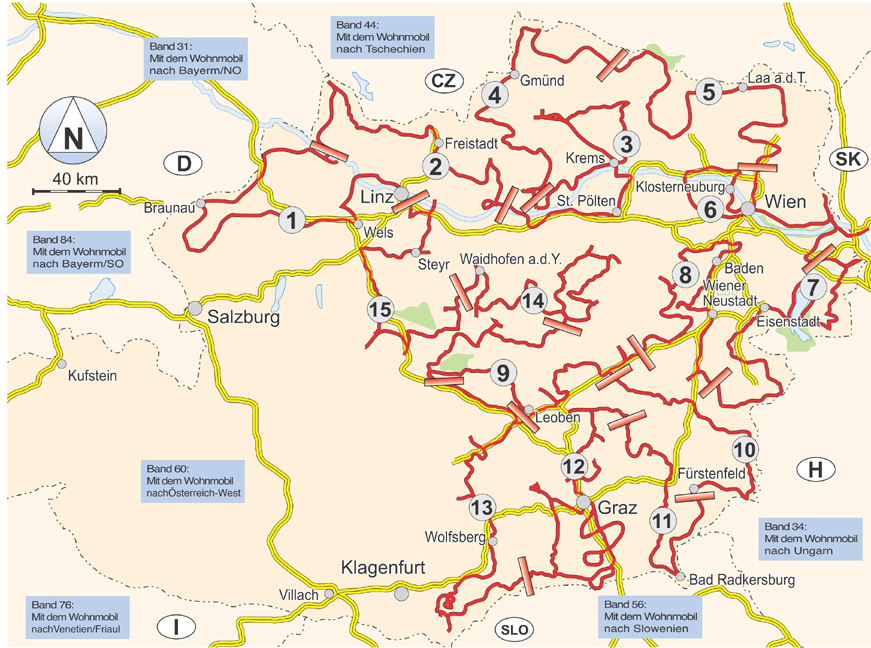 TOURENKARTEN Reisen Sie auf über 4000 Kilometer in 15 Touren zu allen großen Attraktionen und weniger bekannten Orten im Ostteil Österreichs. Sie erhalten genaue Markierung freier Stell-, Bade-, Picknick- und Wander- und Campingplätze inkl. Ausstattung, Einzei...