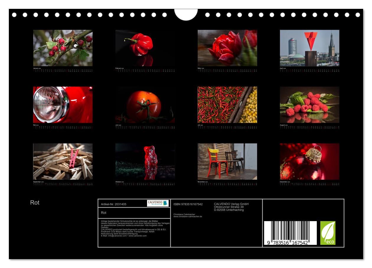 Ein Kalender, ganz speziell für alle, die die Farbe Rot lieben. Als besonderer Blickfang in der Wohnung oder im Büro. Es werden 13 verschiedene Bilder von Christiane Calmbacher gezeigt, auf denen immer etwas rotes heraus sticht. Ein Kalender, ganz speziell für...