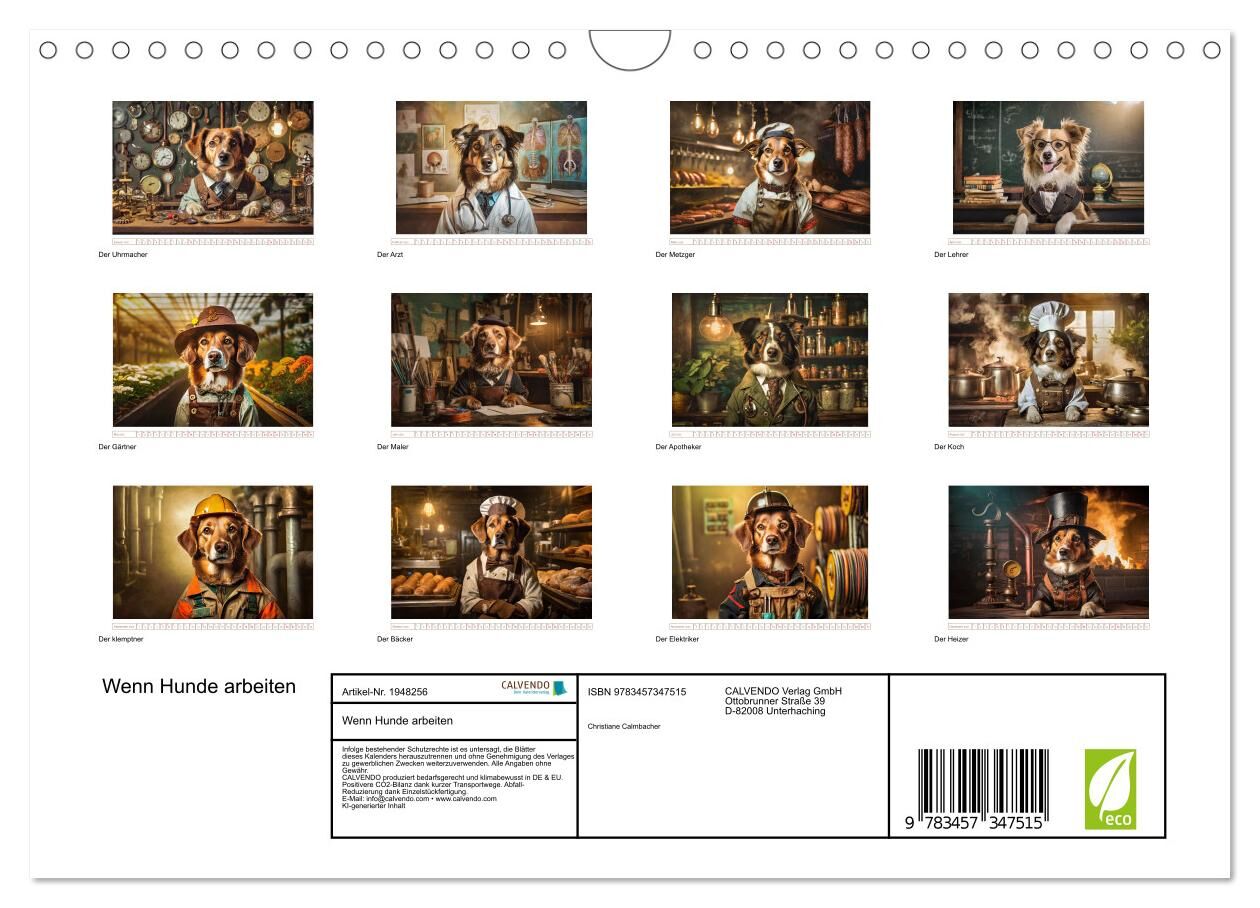 Diese zwölf einzigartigen Bilder sind mit Hilfe von KI erstellt. Sie zeigen wie es aussehen könnte wenn Hunde Berufe ausüben würden. Amüsant und stimmungsvoll sind sie eine schöne Deko. Machen Sie sich und anderen eine Freude damit.