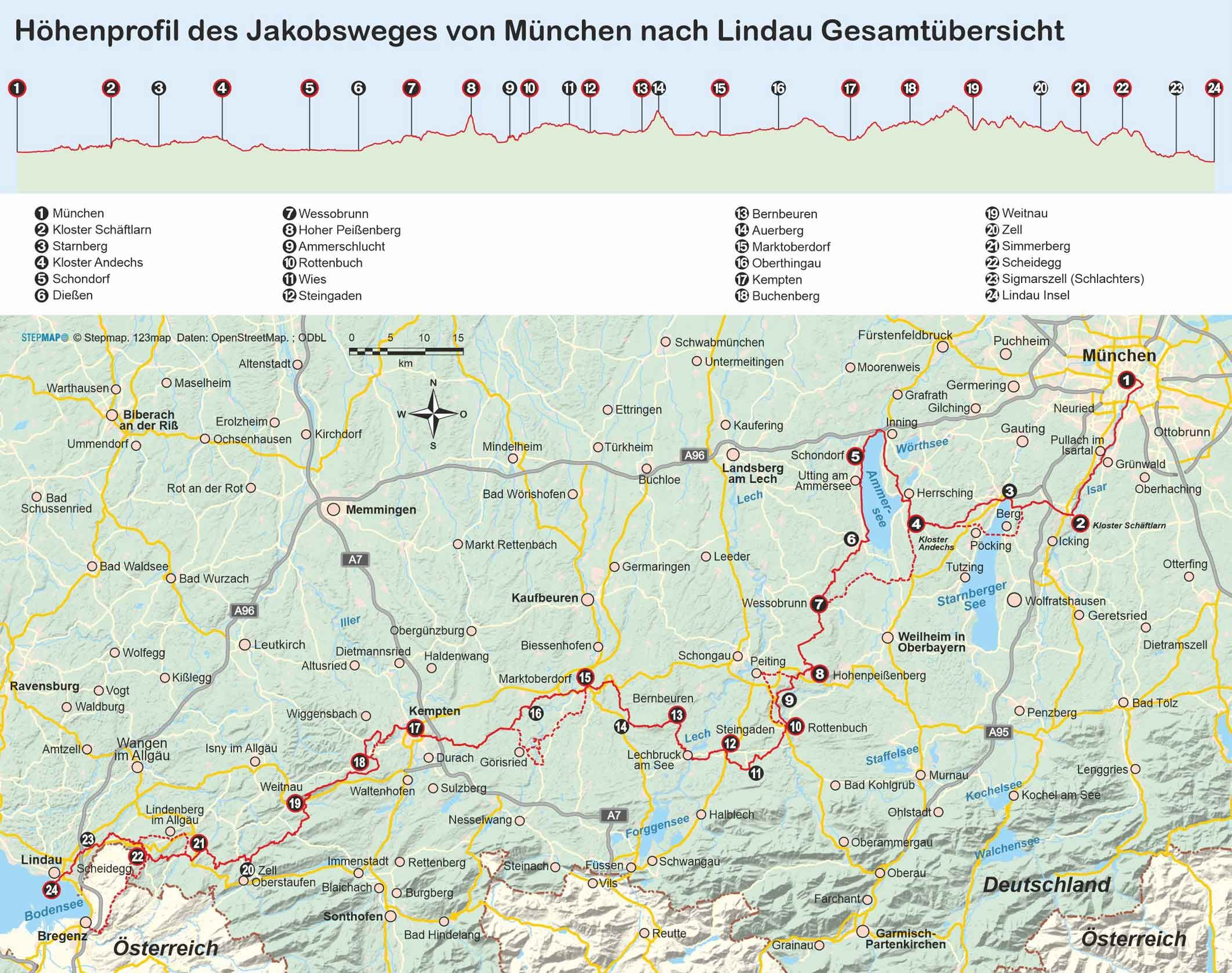 Der Münchner Jakobsweg wurde 2003 eröffnet und führt über idyllische Wege von der Landeshauptstadt über Kempten nach Lindau am Bodensee. Unterwegs werden zahlreiche Wallfahrtskirchen und sehenswerte Klosteranlagen wie Kloster Schäftlarn passiert. Der Pilgerfüh...
