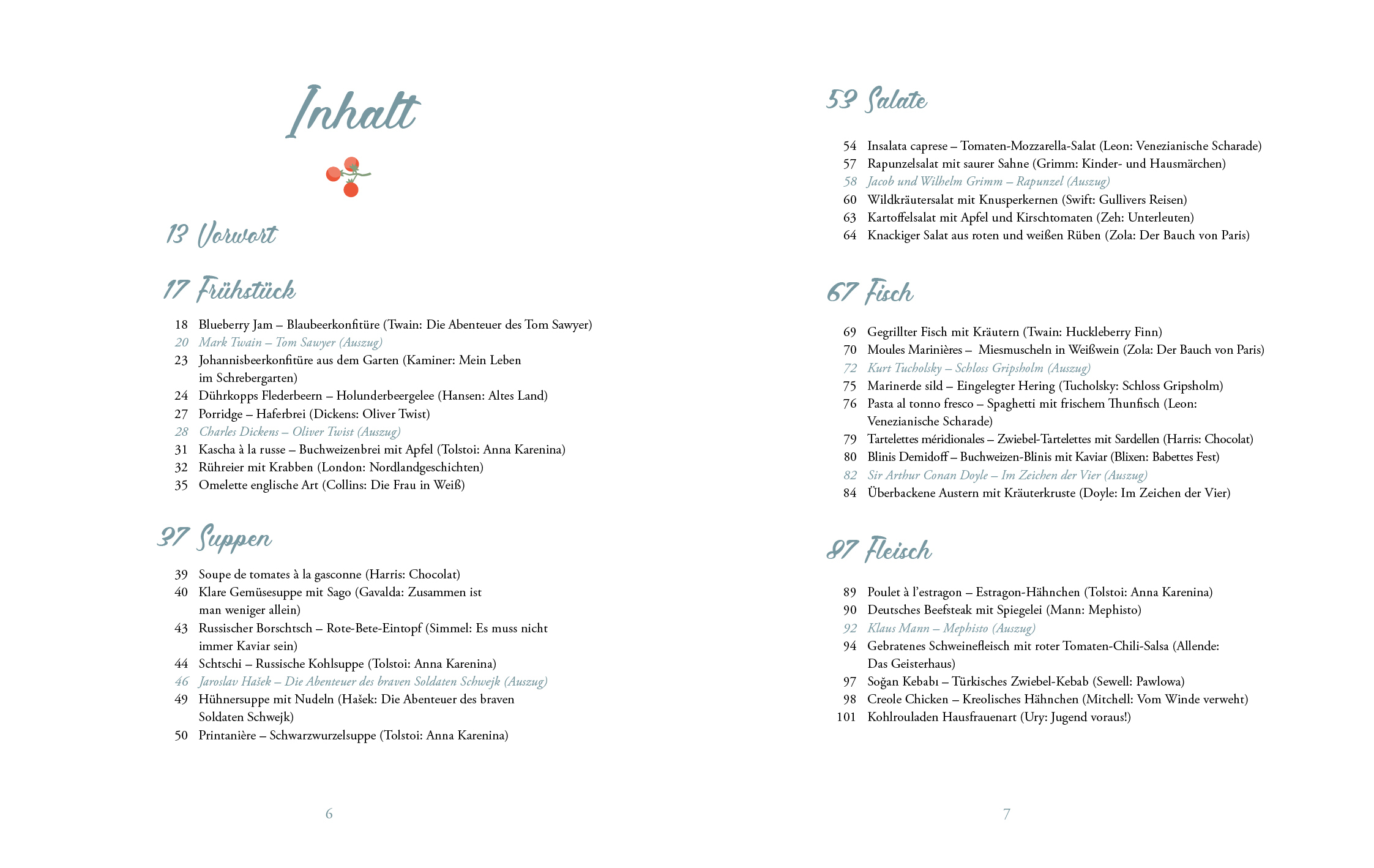 Auch Romanfiguren haben mal Hunger! Ob Scarlett O'Haras Südstaatenküche in Vom Winde verweht, Pfannkuchen aus dem Mumintal, Blaubeermarmelade von Tom Sawyers Tante Polly, italienische Köstlichkeiten bei Commissario Brunetti oder das Lieblingskonfekt von Vianne...