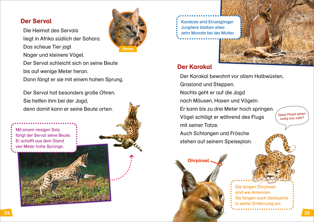 Brüllende Löwen und satt vor sich hin dösende Tiger, pfeilschnelle Geparden und wachsame Luchse: Mit diesem Buch erfahren Leseeinsteiger der Lesestufe 2 (2. Klasse) viel Wissenswertes über die wilden Verwandten unserer Hauskatzen! Die große Fibelschrift, die k...