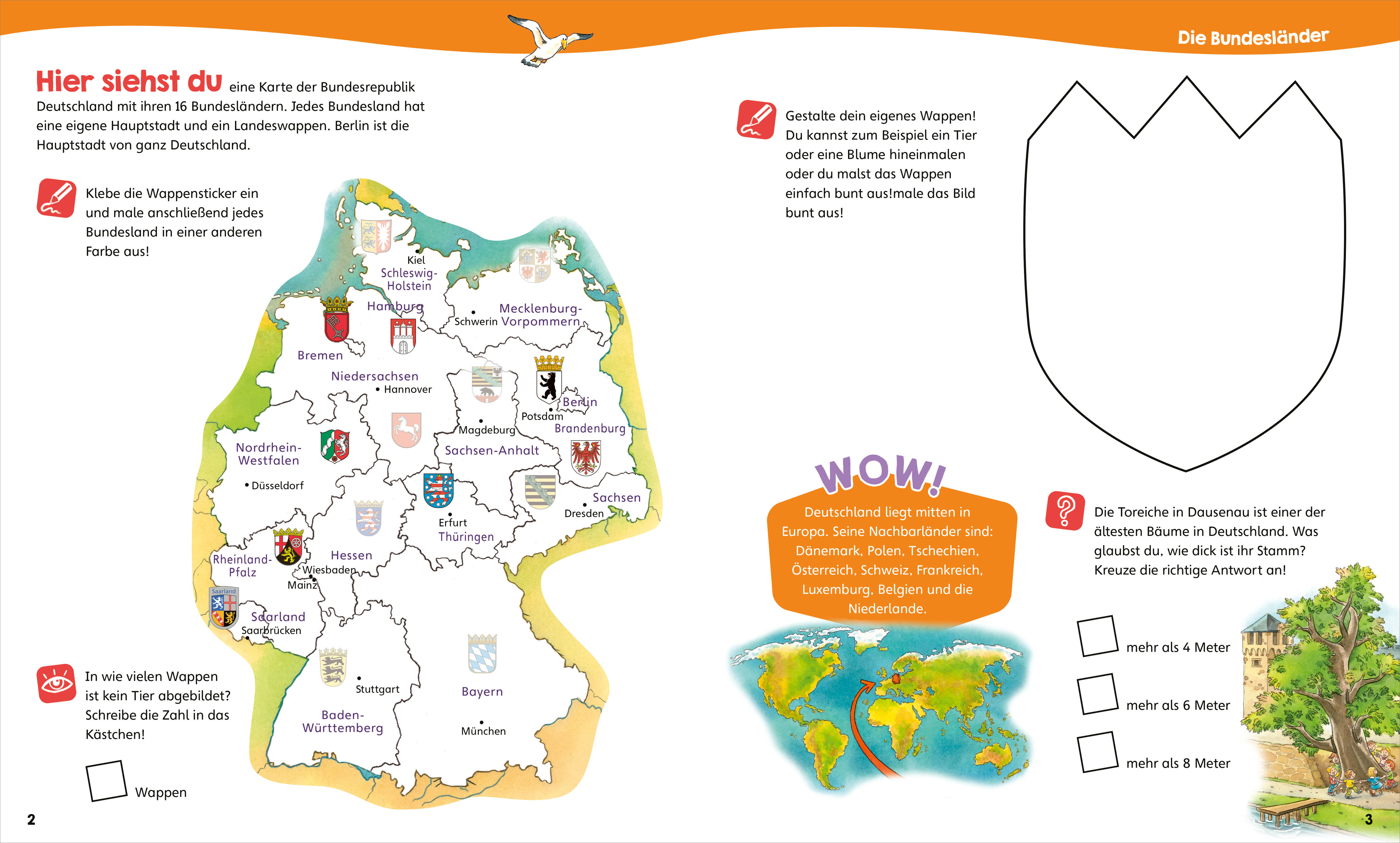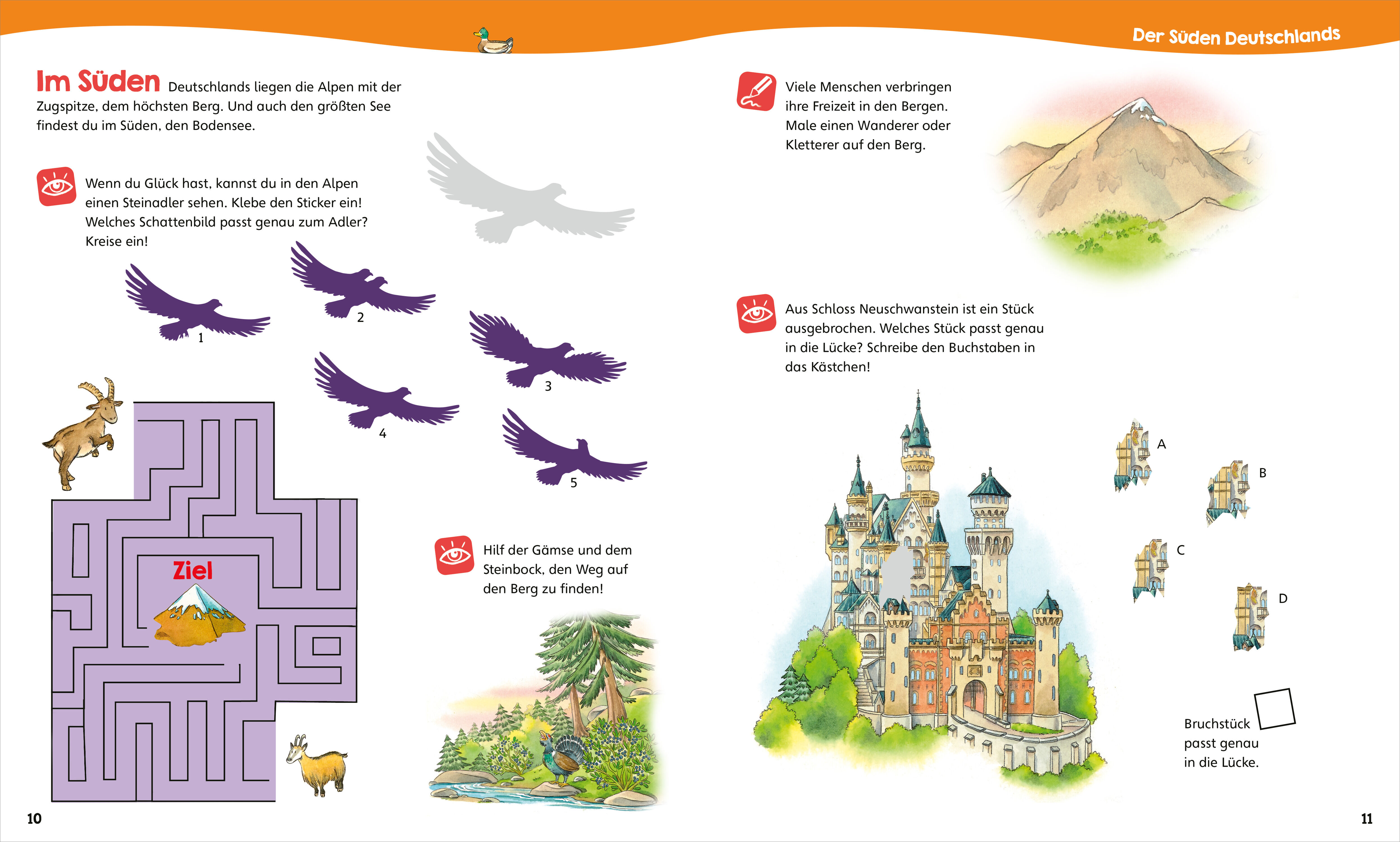 Von der Nordsee zu den Alpen: Eine spannende Reise durch Deutschland beginnt. Welche Euro-Münzen müssen ergänzt werden? Wie sieht die Burg am Rhein aus? Welche ist die größte Stadt, wo fließt der längste Fluss und wie heißt der größte Berg? Wer lebt eigentlich...