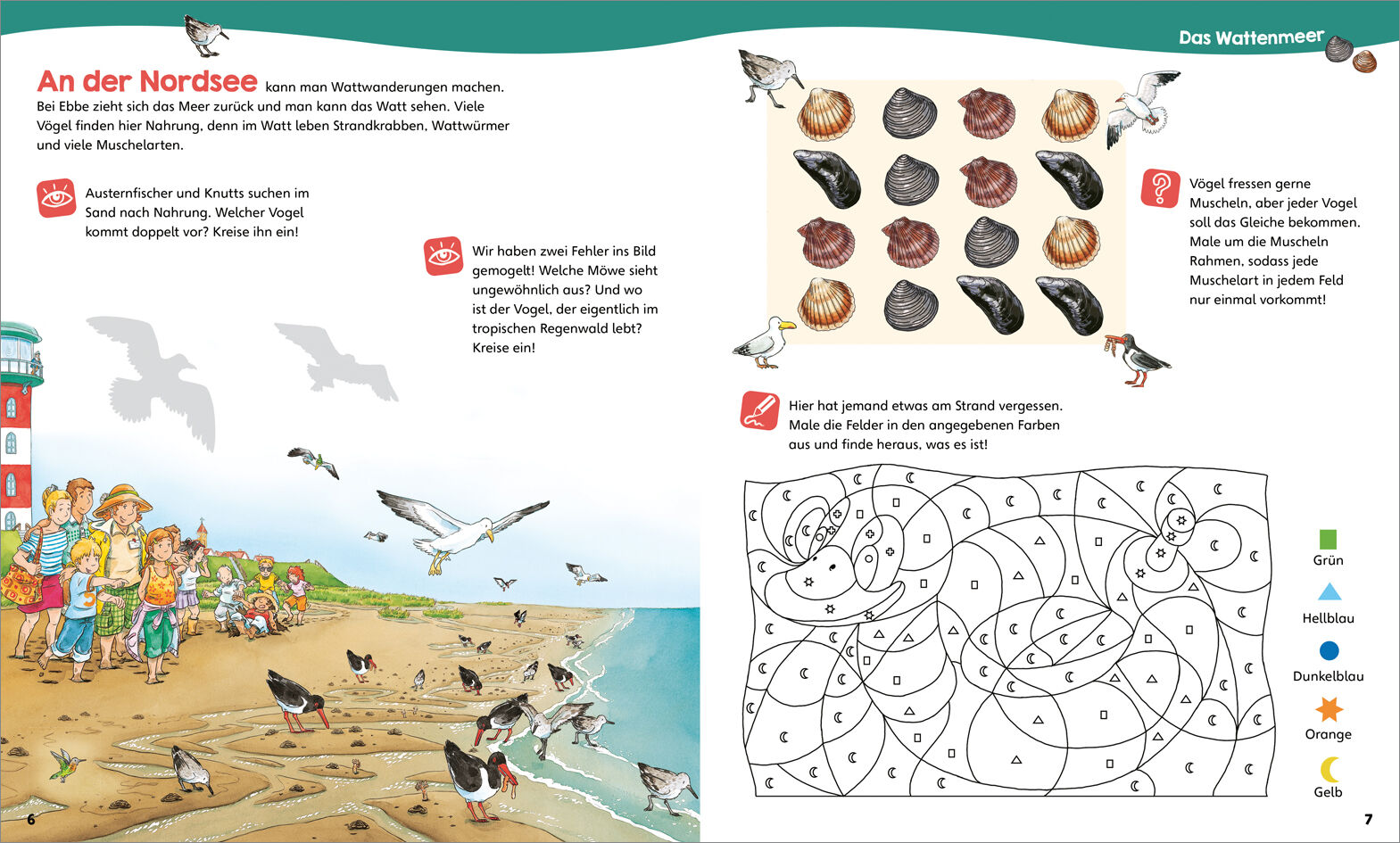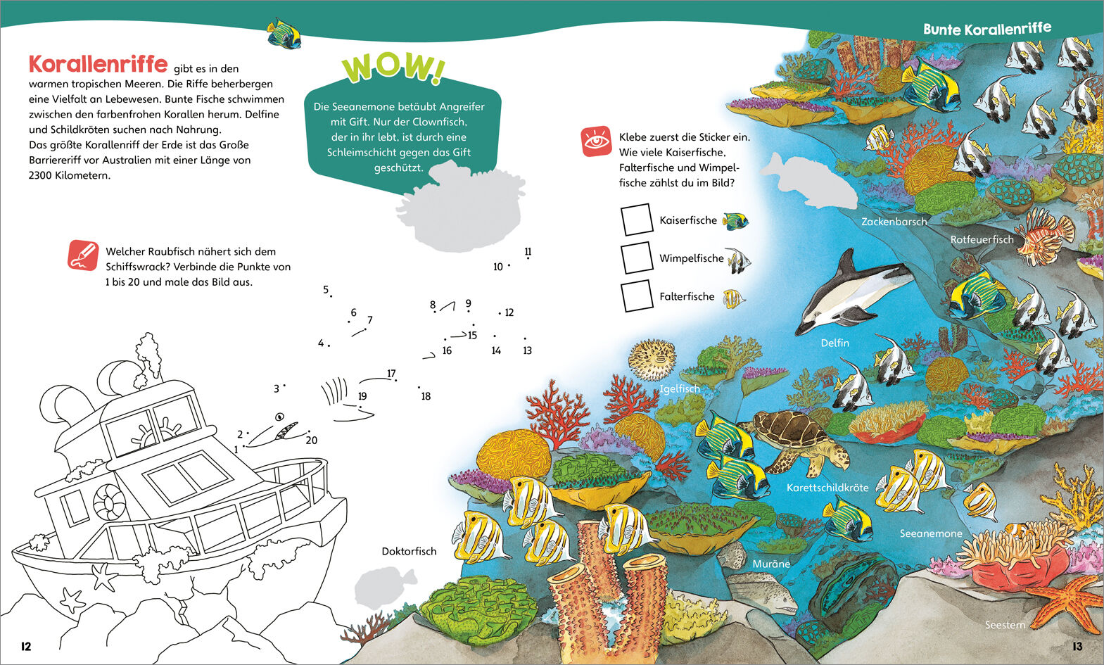 Wie findet der Pinguin seinen Weg durch das Eis-Labyrinth? Welcher Fisch erkundet neugierig das Schiffswrack? Was steht auf dem Speiseplan eines Pottwals? Spielerisch, mit einem bunten Mix aus Stickern, Ausmalbildern und Rätseln lernen die Kinder das Leben im ...