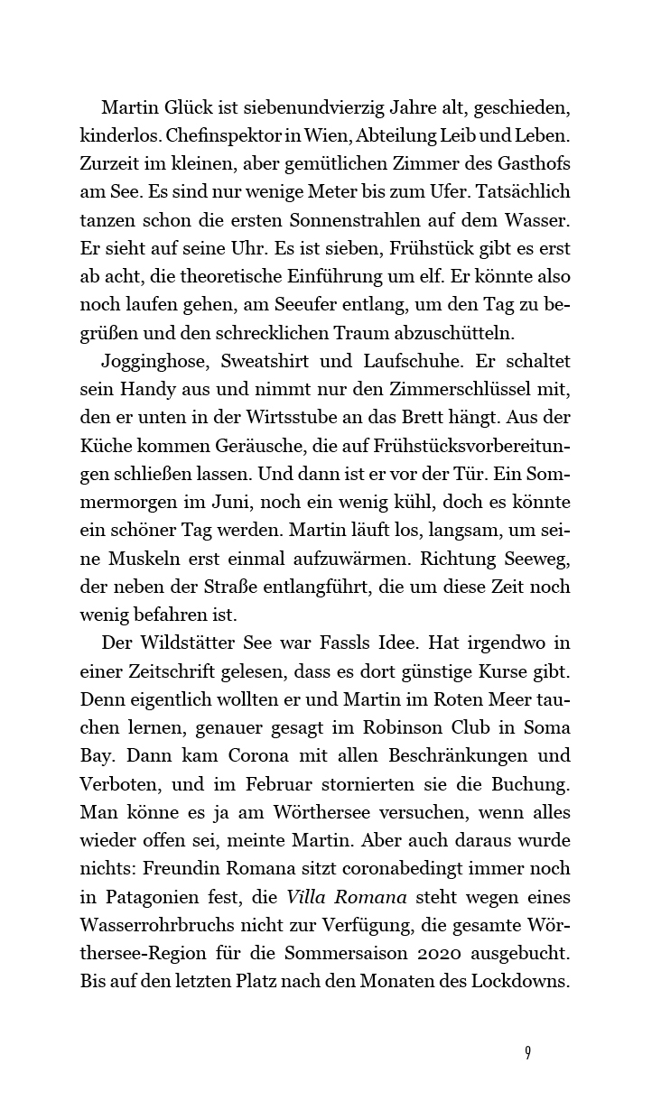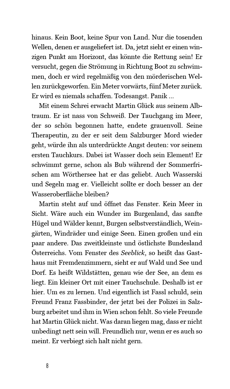 In seinem neuen Fall begibt sich Chefinspektor Martin Glück auf ein Abenteuer unter Wasser und bucht gemeinsam mit Freund und Kollege Fassl einen Tauchkurs. Allerdings nicht wie geplant im Roten Meer, sondern in einem kleinen See in der gar nicht beschaulichen...