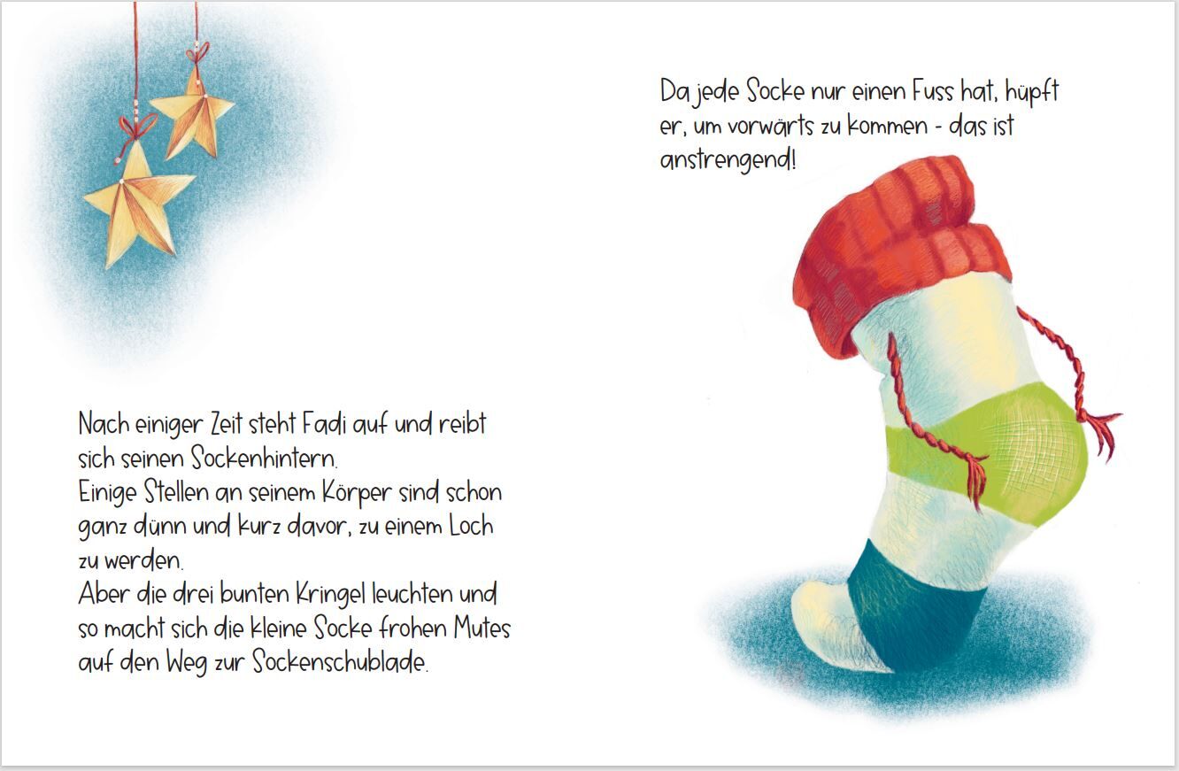 Manchmal braucht es nicht viel, um ein Held zu sein. Fadi, Simonas Lieblingssocke, genügen drei bunte Kringel und ein großes Herz. Auf dem Weg in die Sockenschublade trifft er den traurigen Teppich, das zerfledderte Kleidchen und den eingeklemmten Sockenjunge...