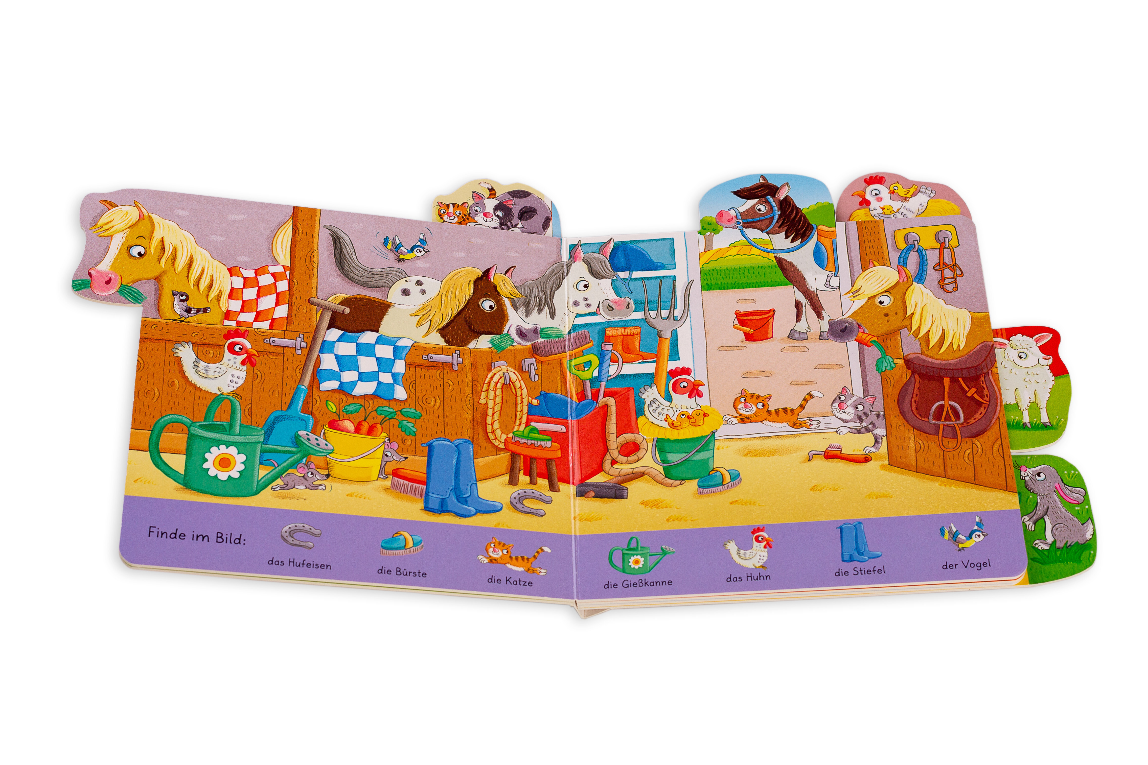 Erster Suchspaß mit formgestanztem Register Wo kräht der Hahn ? Und wo suhlt sich das Ferkel ? Ob im Stall , in der Scheune oder auf Weide : Überall gibt es so viel zu suchen , zu entdecken und zu lernen ! Am Rand der wuseligen Szenen geben die beschrifteten ...