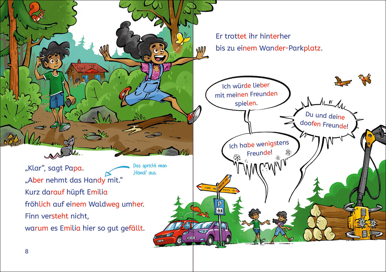 Finn und Emilia machen Urlaub mit ihren Eltern am Waldrand. Total öde bis sie beim Spielen im Wald einen Mann beobachten. Er trägt eine Tasche. Voller Geld? Das muss ein Bankräuber sein. Heimlich nehmen die Geschwister die Verfolgung auf. Ob sie ihn überführen...