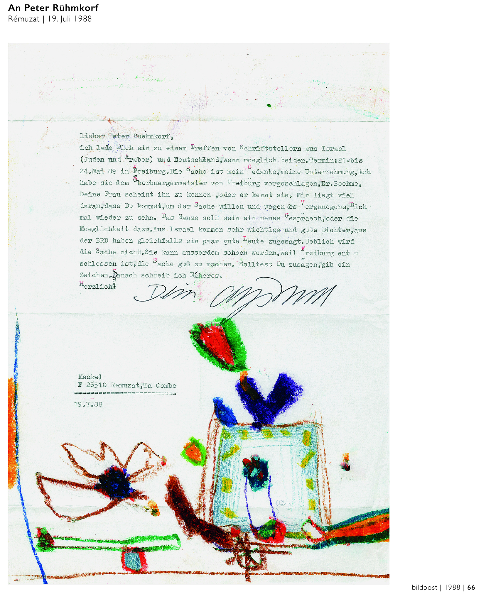 christoph meckel | bildpost | 100 briefe und postkarten aus sechs jahrzehnten | hg. martina hanf | reihe A4+ Mit dem Band bildpost. 100 briefe und postkarten aus sechs jahrzehnten liegt eine ebenso künstlerisch wie liebevoll gestaltete Publikation vor, die ein Stück literarischen und künstlerischen Zeitgeschehens mit dem privaten Dichter- und Künstlerleben von Christoph Meckel in sich vereint. Christoph Meckel, der als einer der bedeutendsten deutschen Autoren und Künstler der Nachkriegszeit gilt, gewährt darin Einblicke in einen sehr persönlichen und der Öffentlichkeit bisher nicht zugänglich gemachten Bereich seines umfangreichen Werks. Zahlreiche Zeichnungen, um die Christoph Meckel seine postalischen Nachrichten an Freunde und Bekannte ergänzt hat, eröffnen dem aufmerksamen Leser und Betrachter eine neue Betrachtungsebene, die das geschriebene Wort und die darin transportierte Aussage auf unersetzbare Weise verstärkt. Das Wort richtet Christoph Meckel unter anderem an die befreundeten Lyriker und Erzähler Johannes Bobrowski und Erich Arendt, letzterer auch ein bedeutender deutscher Übersetzer, die Verlegerin Katharina Wagenbach-Wolff, den Schweizer Bildhauer und Objektkünstler Jürgen Brodwolf und viele andere Autoren und Künstler, die das intellektuelle und künstlerische Leben im Deutschland der Nachkriegszeit so nachhaltig mitgestaltet und beeinflusst haben. Die Briefe und Postkarten samt ihren Farb- und Schwarzweiß-Illustrationen, die als Faksimiles im Band abgebildet werden, tragen dazu bei, mit der Lektüre und Betrachtung ein lebendiges Erlebnis zu erzeugen. Bereichernde Welten tun sich auf, lässt man Christoph Meckels Freude am Sprachspiel und sein Faible für kindlich inspirierte Zeichnungen, die so aufgeladen sind von poetischem Geist, auf sich wirken. Ein wichtiges Augenmerk gilt auch der Übertragung der Handschrift des Künstlers, die hier als Transkription jeweils neben der entsprechenden Brief- oder Postkartenabbildung verweilt: das Original unverfälscht und unter Berücksichtigung besonderer Sprach- und Schreibeigenheiten des Verfassers wiedergebend. Als Initiatorin des genreübergreifenden Buchprojektes und maßgeblich an dessen Umsetzung beteiligt ist die Herausgeberin Martina Hanf, die in Absprache mit Christoph Meckel und dem Verleger und Gestalter Michael Wagener eine besondere Auswahl aus dem Brief- und Postkartenbestand getroffen und die entsprechenden Texte auch transkribiert hat. Die von ihr in einem langen und intensiven Arbeitsprozess in Archiven sowie bei Privatpersonen mit großer Sorgfalt gesichteten und akribisch zusammengetragenen Dokumente, wie sie hier chronologisch in Form von Briefen und Postkarten aus den Jahren 1958 bis 2014 vorgestellt werden, zeugen nicht weniger von einer großen Liebe des Dichters zur Sprache als von jener des Grafikers und Zeichners zum Bild.