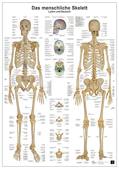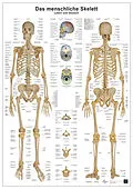 Diese Tafel stellt in ausgezeichneter Qualität und Ausführung ein idealisiertes, echtes Skelett in allen Details dar. Beschriftung in Latein und Deutsch.