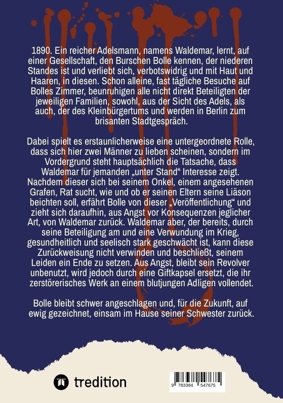 Ein reicher Adelsmann namens Waldemar lernt auf einer Gesellschaft den Burschen Bolle kennen, der niederen Standes ist, und verliebt sich verbotswidrig und mit Haut und Haaren in diesen. Schon alleine fast tägliche Besuche auf Bolles Zimmer beunruhigen alle ni...