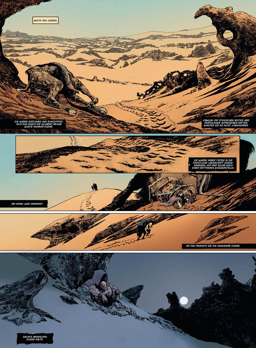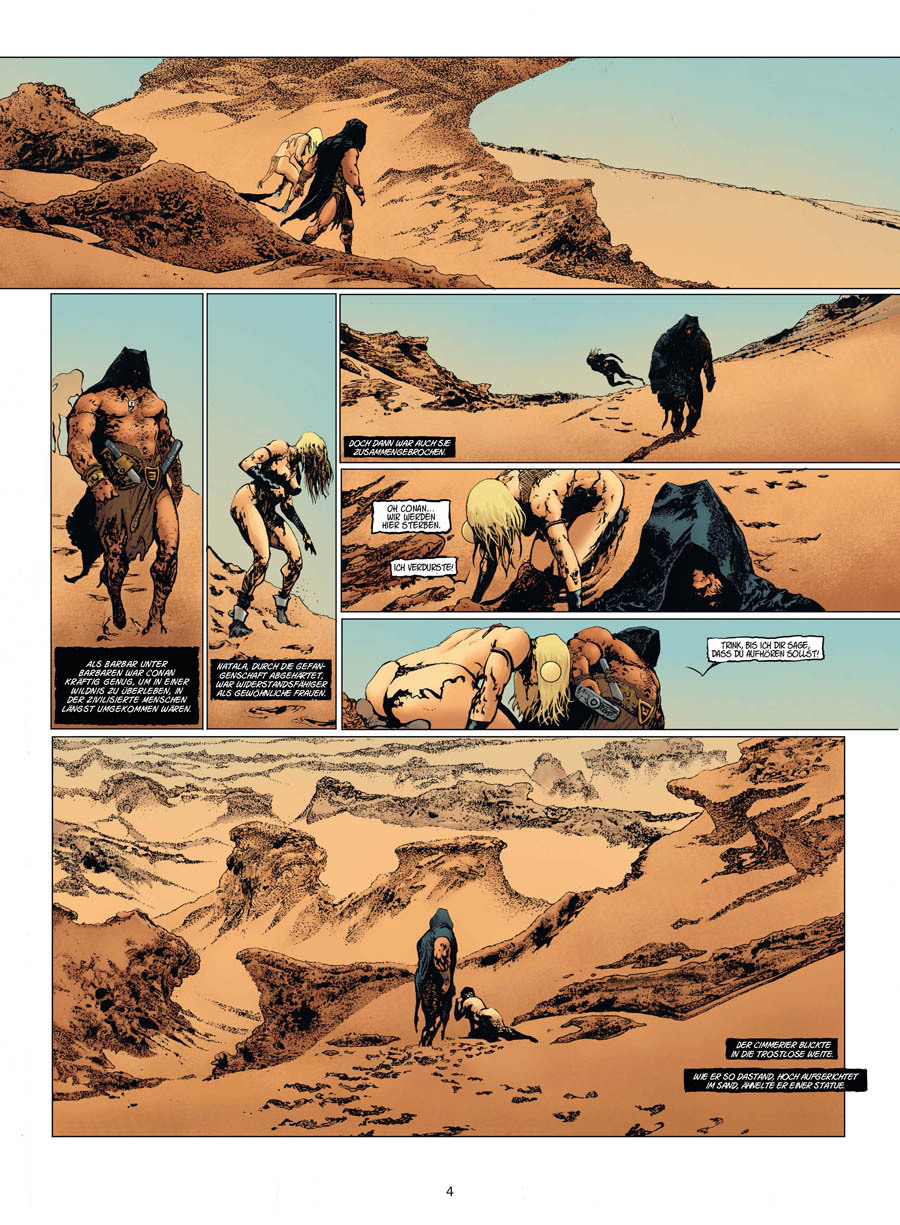 Verloren in den endlosen Sandwogen der Wüste, der sengenden Sonne und dem Durst wehrlos ausgeliefert, schleppen Conan und die befreite Sklavin Natala sich voran. Nahrung und Wasser gehen zur Neige, und an diesem Ort bedeutet das nur eins: den Tod. Da erblickt ...