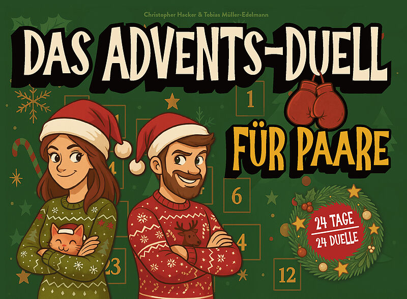 Das Advents-Duell für Paare wer hat das Zeug zum Weihnachts-Champion? Vergesst herkömmliche Adventskalender hier warten 24 Tage voller Spaß, Abwechslung und Wettkampf auf euch! Ob Pustefußball, Emoji-Quiz, Papierflieger-Weitwurf oder lustige Geschicklichkeitss...