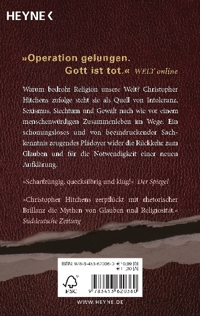 Religion und der Glaube an Gott sind von Menschen gemachte Dinge, die alles vergiften . Christopher Hitchens, erfolgreicher Journalist und bekennender Atheist, beschreibt prägnant und schonungslos, wie Religion zur Gewalttätigkeit gegen Andersgläubige und Ungläubige führt. In seinem fulminanten Rundumschlag beleuchtet er Entstehung, Verbreitung und Wirkung von Glaubensgemeinschaften und macht deutlich, wie verheerend ihr Einfluss auf Politik und Gesellschaft gerade heute (wieder) ist. DIE Antwort auf das Thema Glauben: informativ, unterhaltsam, provokant.