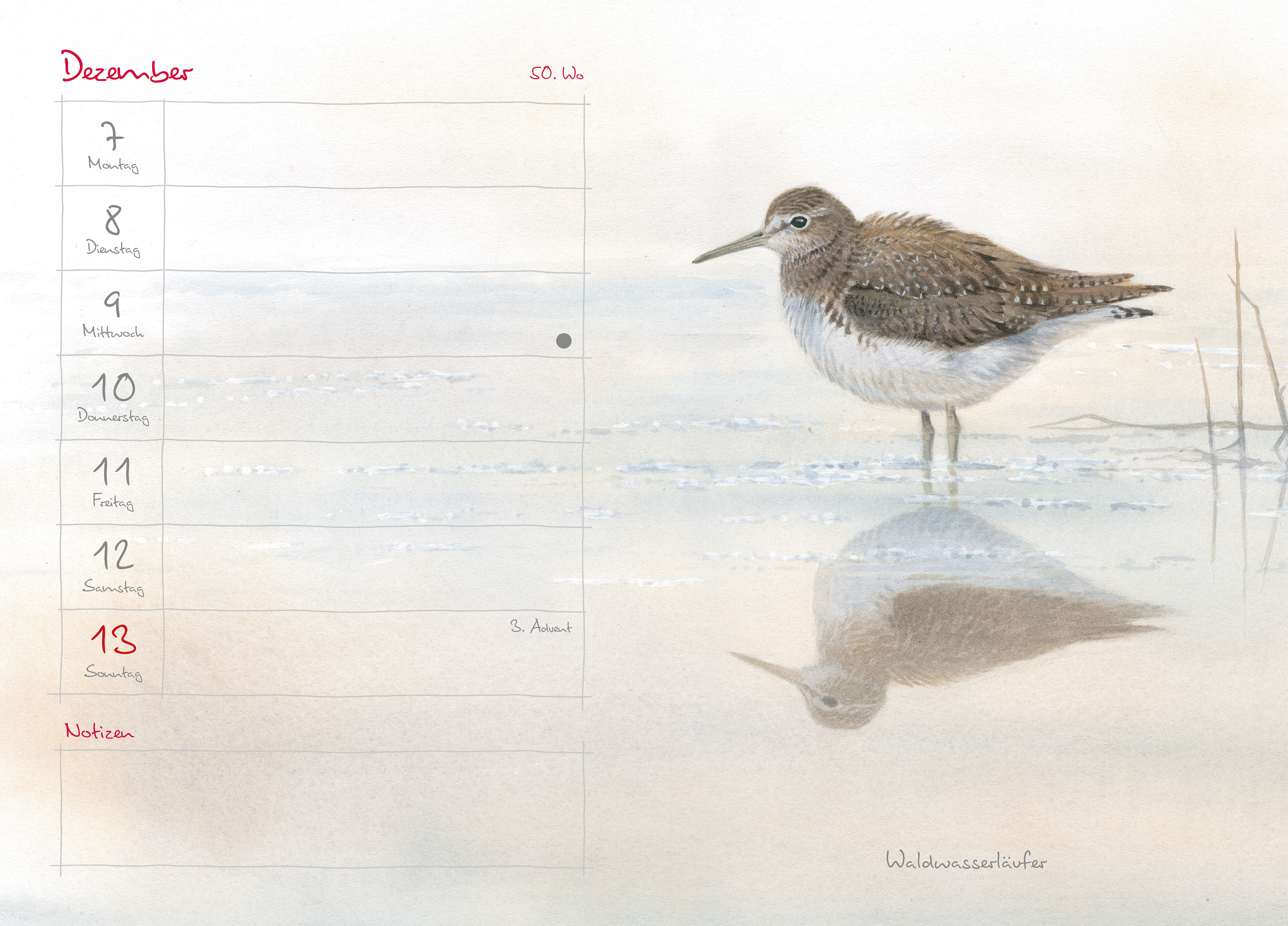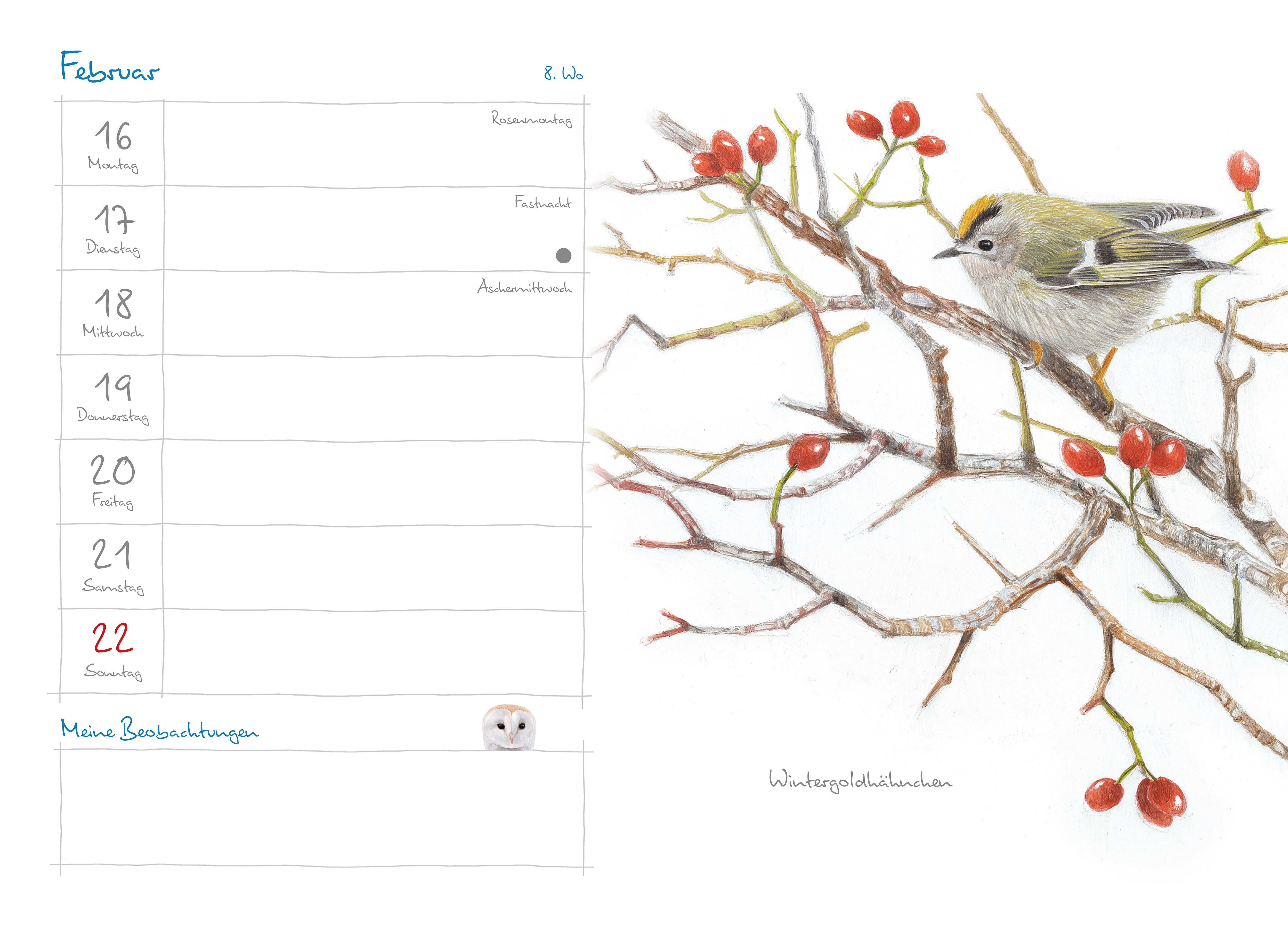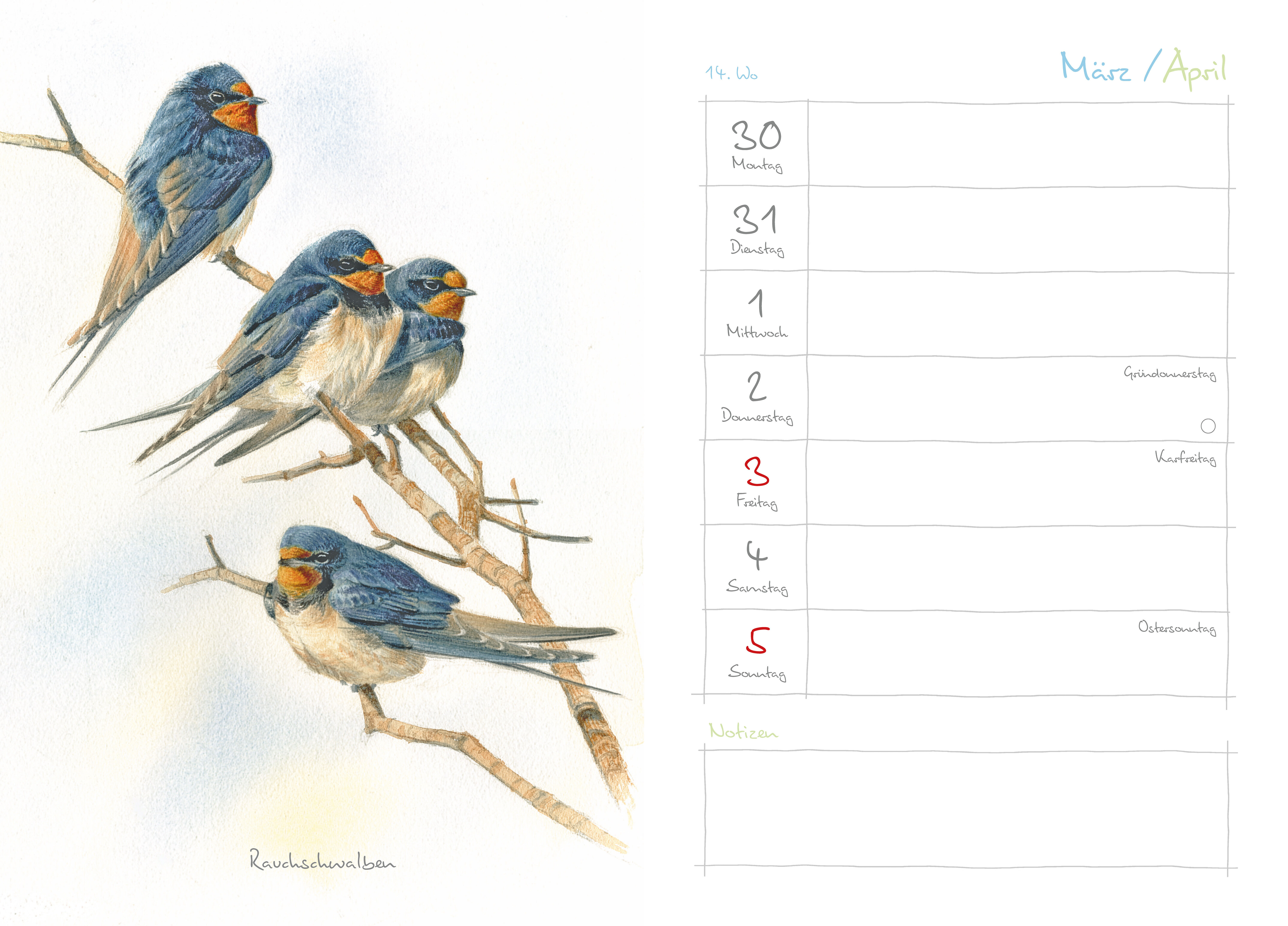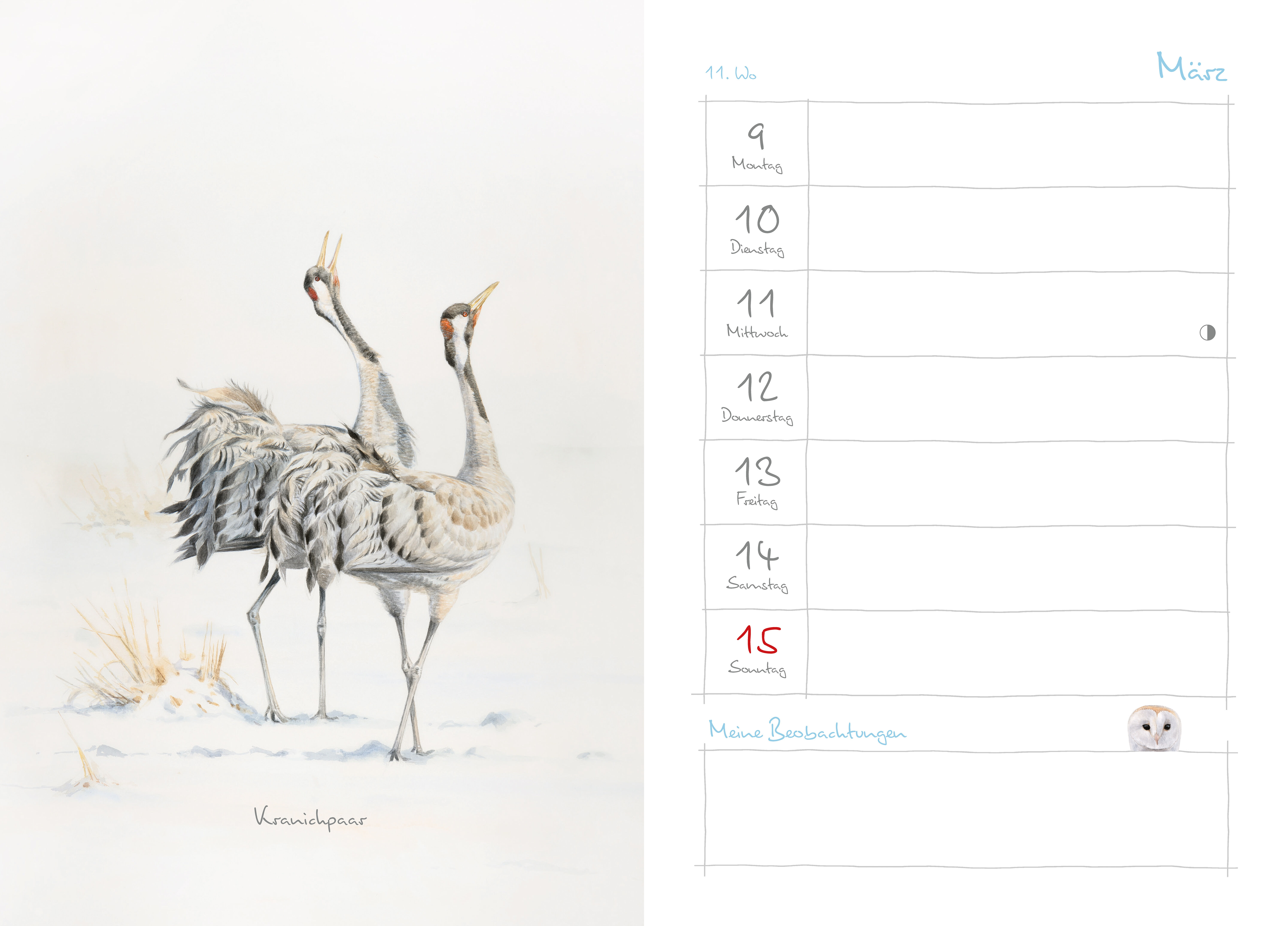 Seit über zehn Jahren ist »Mein Naturkalender« ein steter Begleiter für kunstinteressierte wie naturverbundene Menschen. Mit einer Vielzahl farbiger Aquarelle von Vögeln und anderen Tieren, von Pflanzen und heimischer Natur führt dieser Wochenkalender durch di...