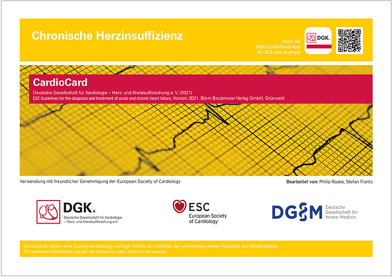Die CardioCard zur chronischen Herzinsuffizienz basiert auf der übersetzten ESC-Guideline ESC Guidelines for the Diagnosis and Treatment of Acute and Chronic Heart Failure und ist eine Zusammenstellung der wichtigsten Leitlinien-Inhalte. Auf nur drei Inhaltsse...