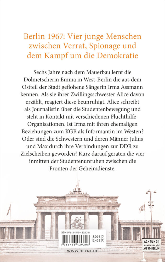 Sechs Jahre nach dem Mauerbau lernt die erfolgreiche Dolmetscherin Emma in West-Berlin die aus dem Ostteil der Stadt geflohene Sängerin Irma Assmann kennen. Als sie ihrer Zwillingsschwester Alice davon erzählt, reagiert diese beunruhigt. Alice schreibt als Jou...