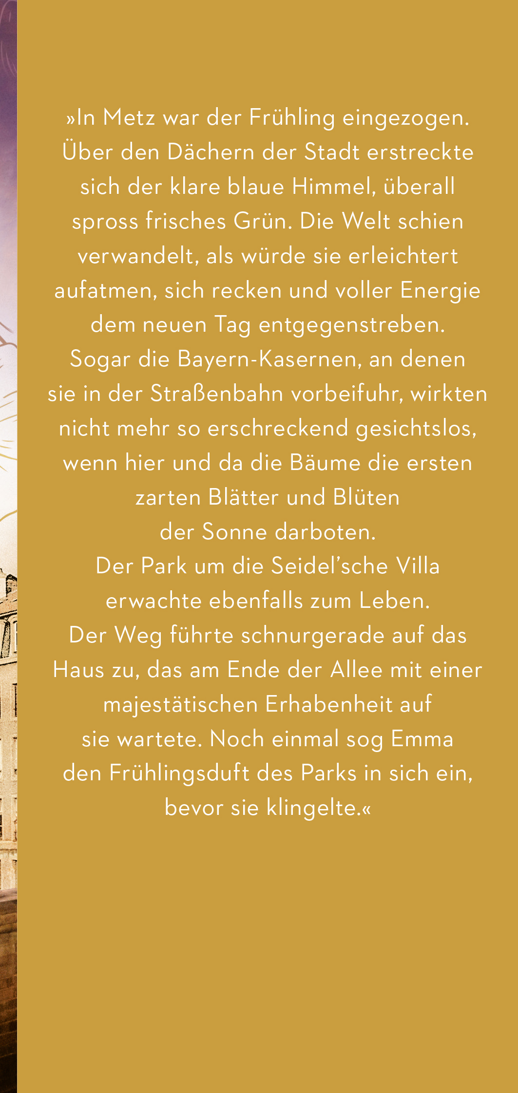 Metz, Elsass-Lothringen, 1908: Die freigeistige Emma ist Feuer und Flamme. Endlich werden Frauen an der Universität zugelassen, sie könnte studieren. Die Eltern dagegen wollen sie mit dem jungen Carl Seidel verheiraten. Carl liebt die Welt des Geschmacks. Er ...