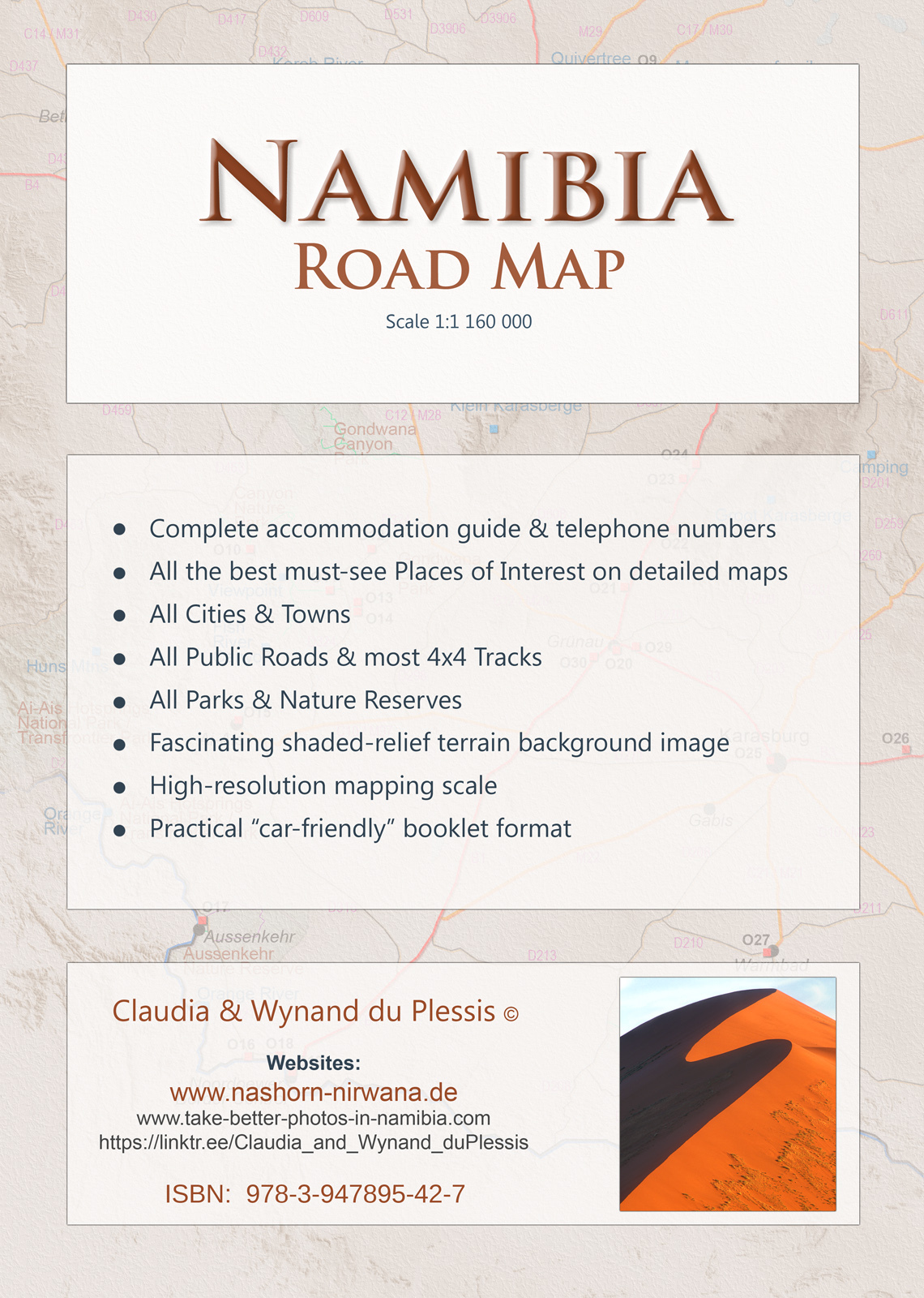 Die Namibiakarte NAMIBIA ROAD MAP ist ideal für eine reibungslose Planung & Reise vor Ort. Alle wichtigen Details wie Straßen, Schotterpisten, Sehenswürdigkeiten, Nationalparks, Naturreservate, Städte inkl. Stadtpläne von Windhoek & Swakopmund sind Tei...