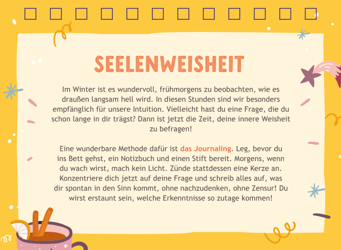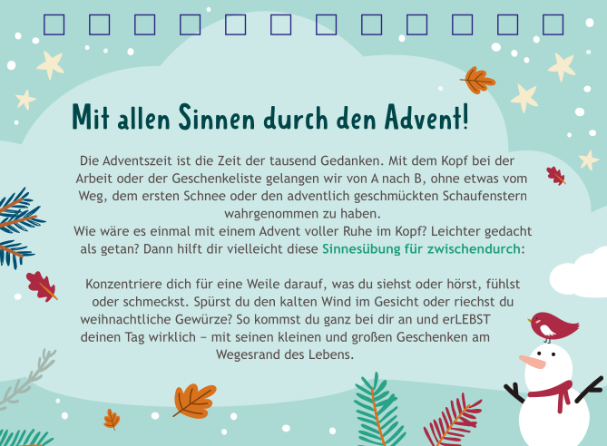Achtsam durch den Advent Ein Adventskalender zum Aufstellen, zum Innehalten, Besinnen und Genießen. Dieser Weihnachtskalender zum Aufstellen hält für jeden Tag im Advent ein Gedichten, eine kleinen Ermutigungen, Denkanstößen und Ideen, um sich selbst etwas Gut...