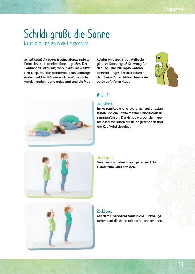 Kinder lieben Bewegung aber nur entspannte Kinder bewegen sich gern! In Schildi Schildkröte greift zu finden Sie daher ausgewählte Haltungen aus Yoga und Kinesiologie und speziell abgestimmte Übungsabfolgen, die Verspannungen lösen, Muskulatur und Körper kräft...