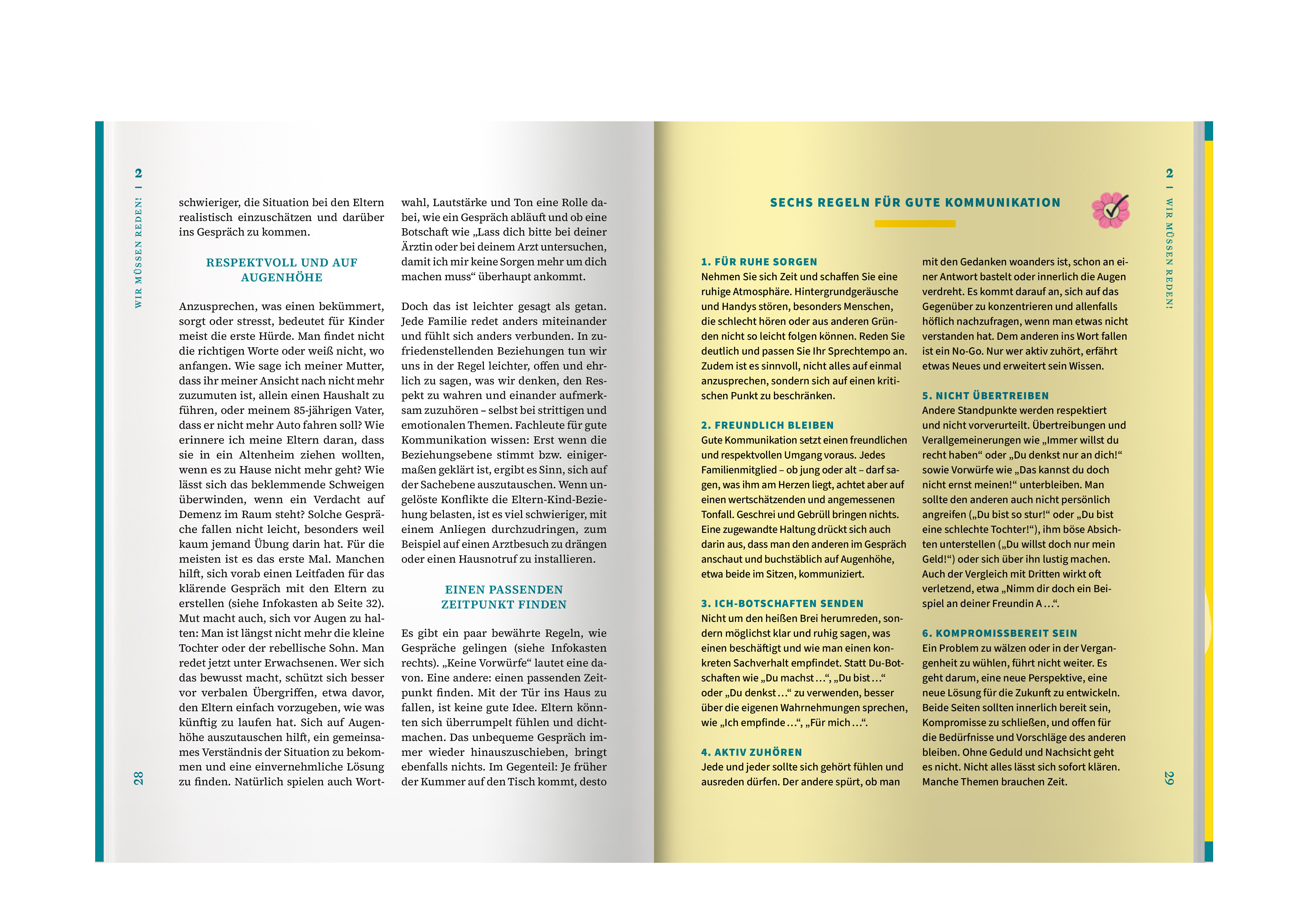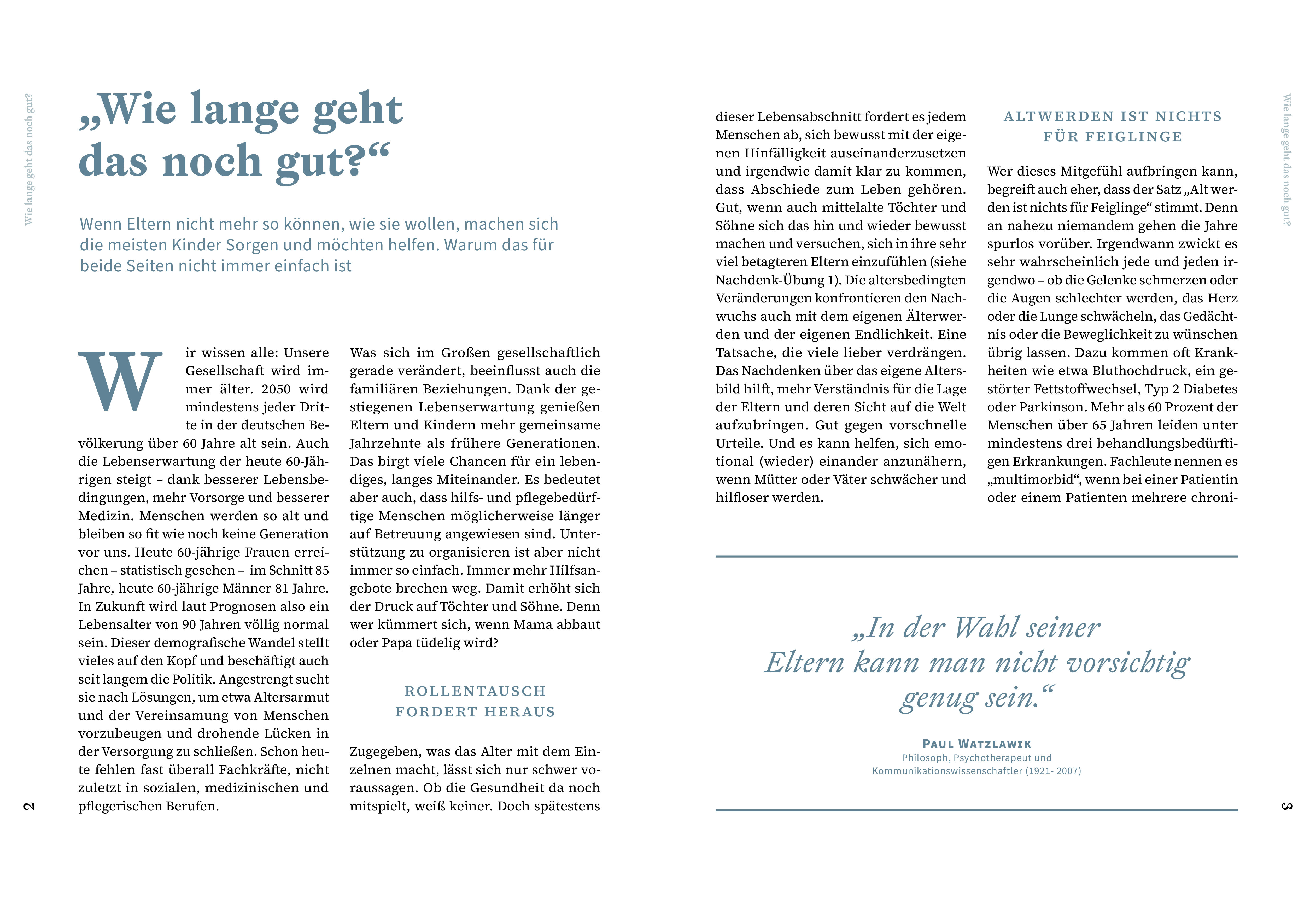 Wenn Eltern alt werden und zunehmend auf Hilfe angewiesen sind, ist das für alle in der Familie herausfordernd. Plötzlich ist nichts mehr wie immer. Aber wie gelingt es erwachsenen Kindern, was ihnen Sorgen macht, anzusprechen ohne Streit und Missverständniss...