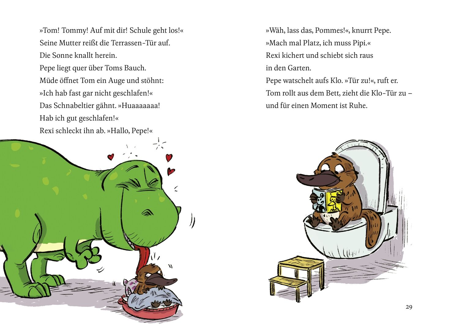 Ein vorlautes Schnabeltier, das scheinbar alles kann und weiß. Schon wieder hat eines der Schulhühner in Toms Schule ein buntes Ei gelegt. Dabei hat Tom doch schon einen kleinen T-Rex zu Hause! Was für ein Wesen schlüpft diesmal? Fell, Schwimmflossen und Bibe...